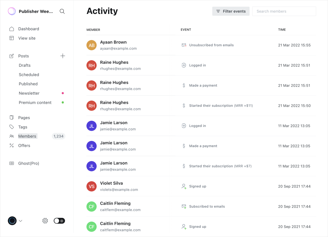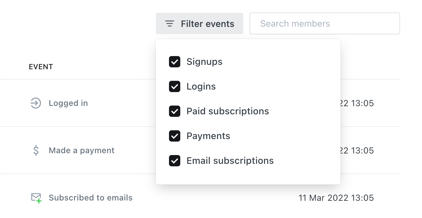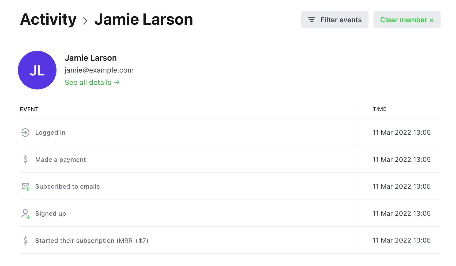 The activity feed can be accessed from the dashboard, or from any individual member profile, and includes all events such as new signups, paid subscriptions, email subscription events and more.