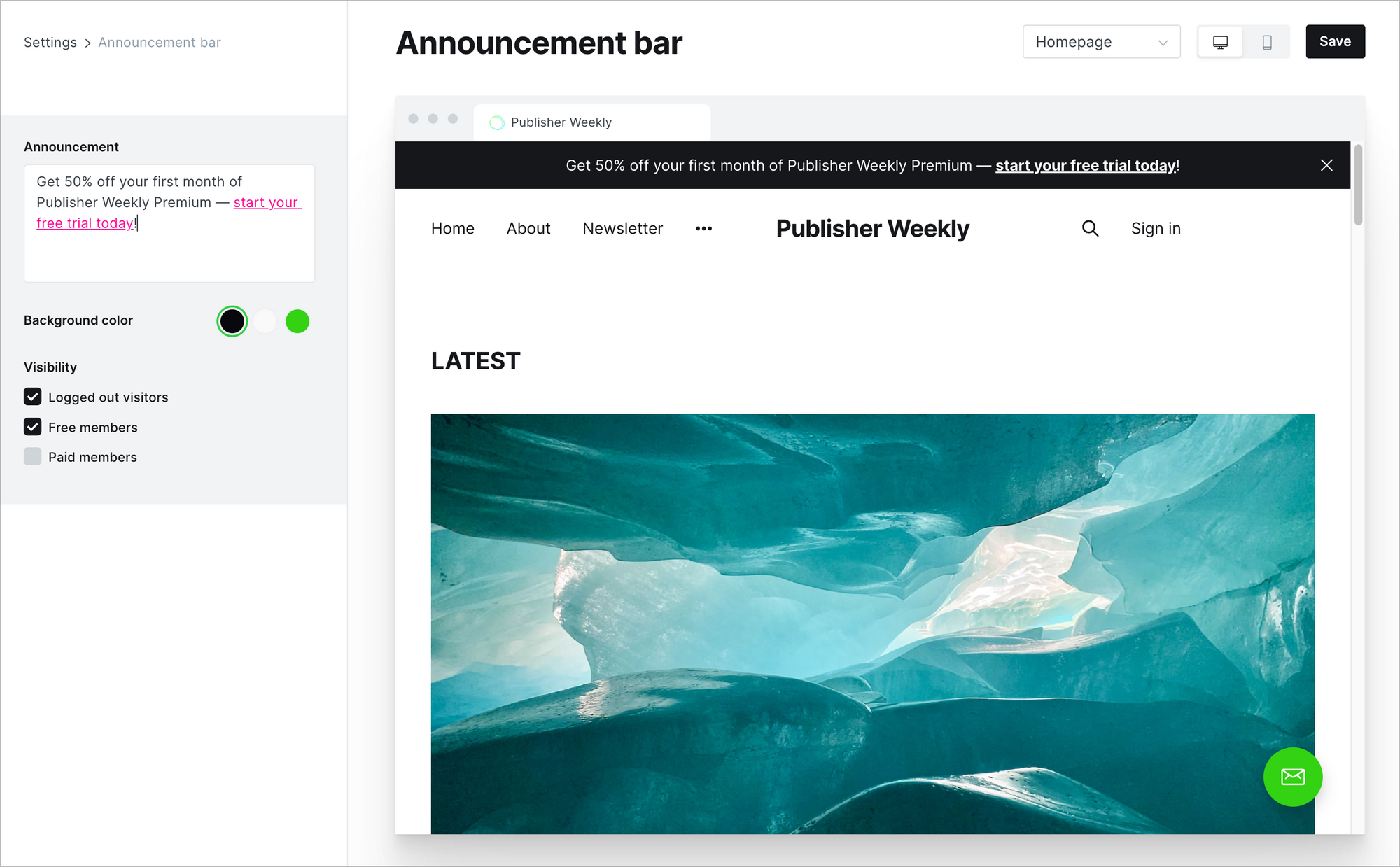 Share big stories, special offers, or breaking news at the top of your site with the new announcement bar feature.