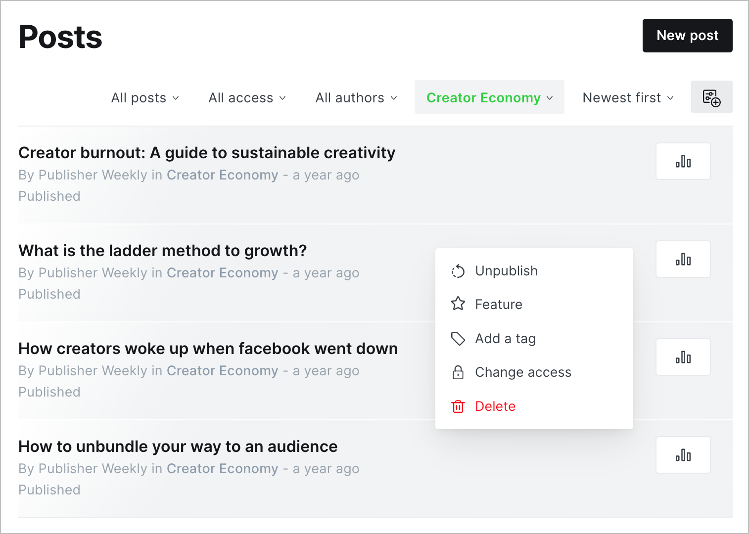 From here you can perform actions such as adding tags, changing post access, adding or removing the featured status, or unpublishing multiple posts at once.