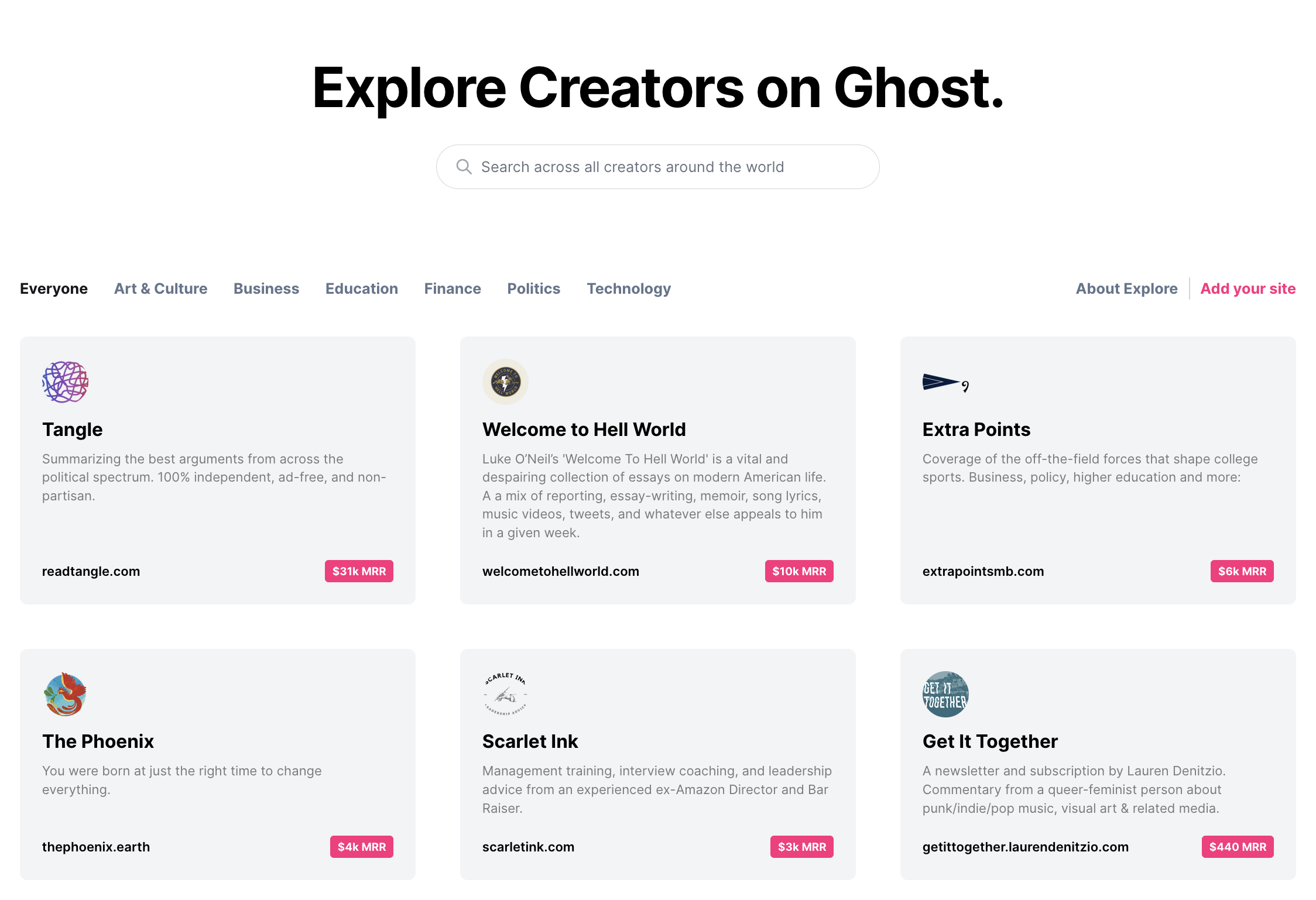 Ghost Explore is the new home of the Ghost creator network — built to give creators and readers alike a place to discover their favourite publications. Whether you're looking for your next read, or looking for inspiration, there is something here for everyone.
