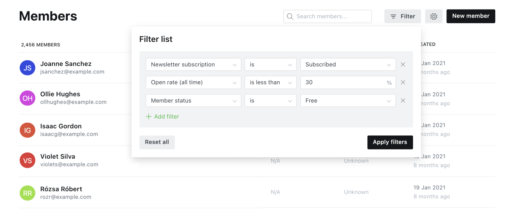 It's now possible to filter your members by label, email subscription status, member status, billing period, emails opened, emails sent, email open rates, and more.