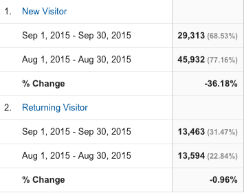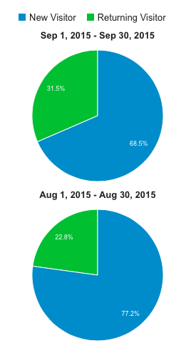 As you can see in the graphs above, however, in September we've had fewer visits overall compared to August. The absolute number of returning visitors is about the same, but the percentage is much higher in September because we had fewer new visitors.