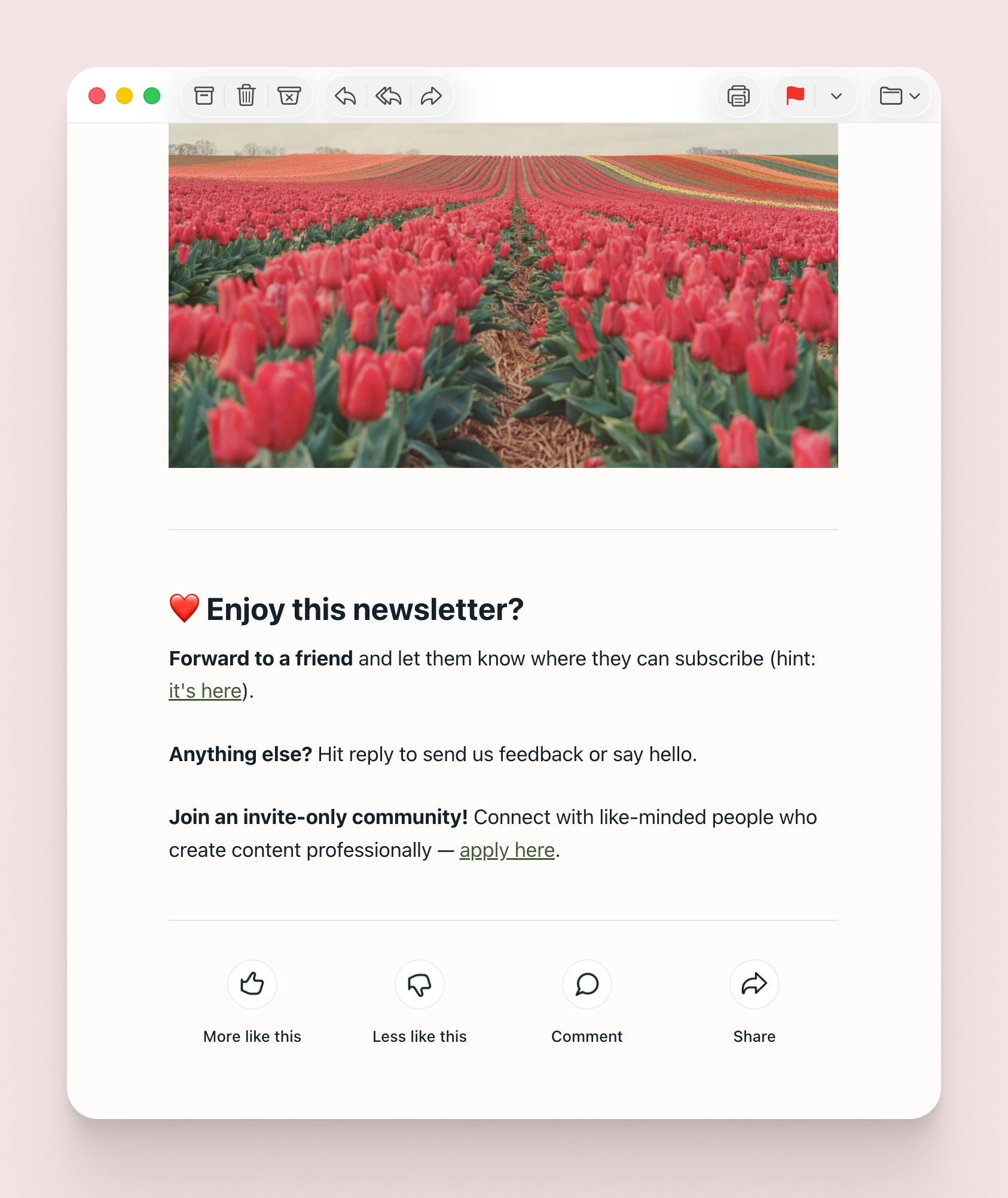 Readers can also reach the same share modal in one click from your newsletter. Toggle on the share option in your newsletter design settings, and every email ends with a link that takes readers to your post with the share options already open — giving your readers a direct path from inbox to sharing with their audience, without ever leaving the flow.
