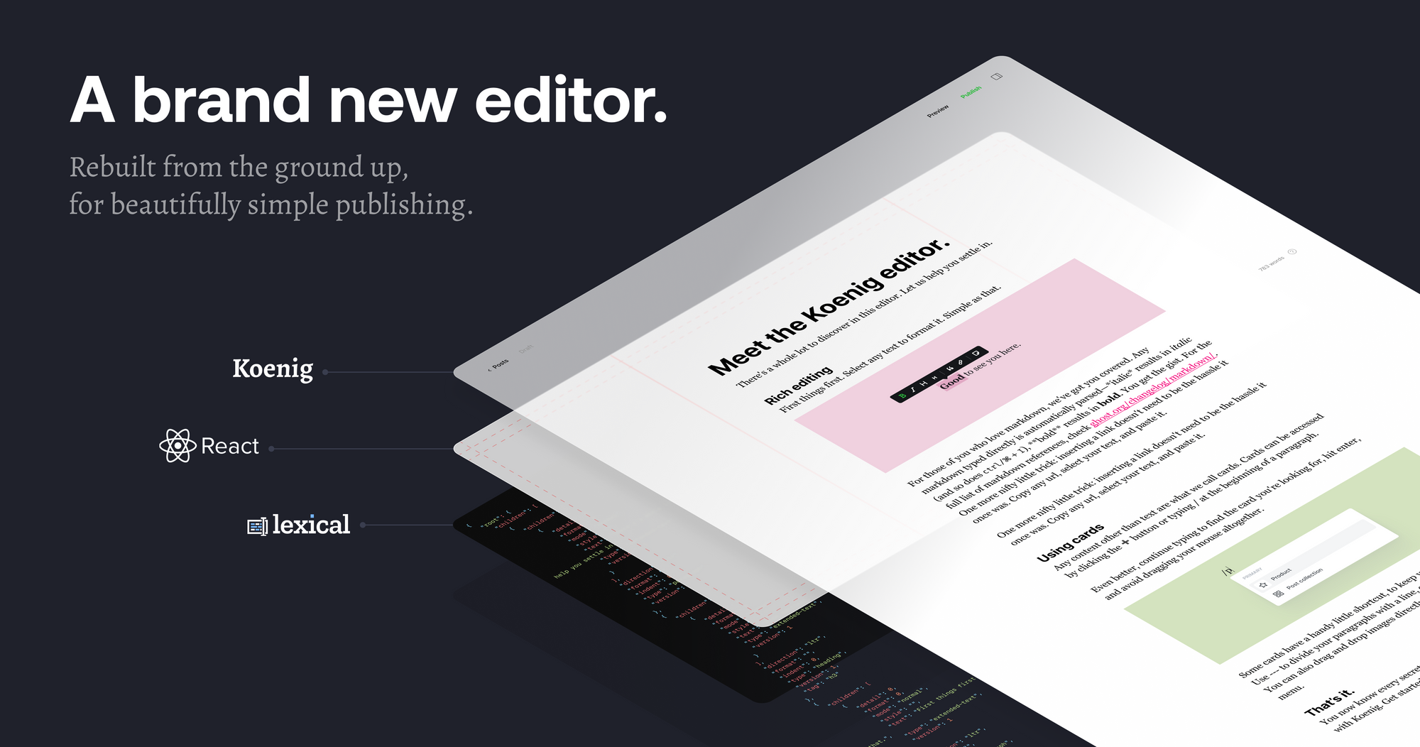 Koenig has now been rebuilt on a new stack: React.js and Lexical — both of which are open source frameworks developed by Meta. So, Ghost is now using the same underlying technology that powers every single editor, comment box, or user input for billions of users across Facebook and Instagram.