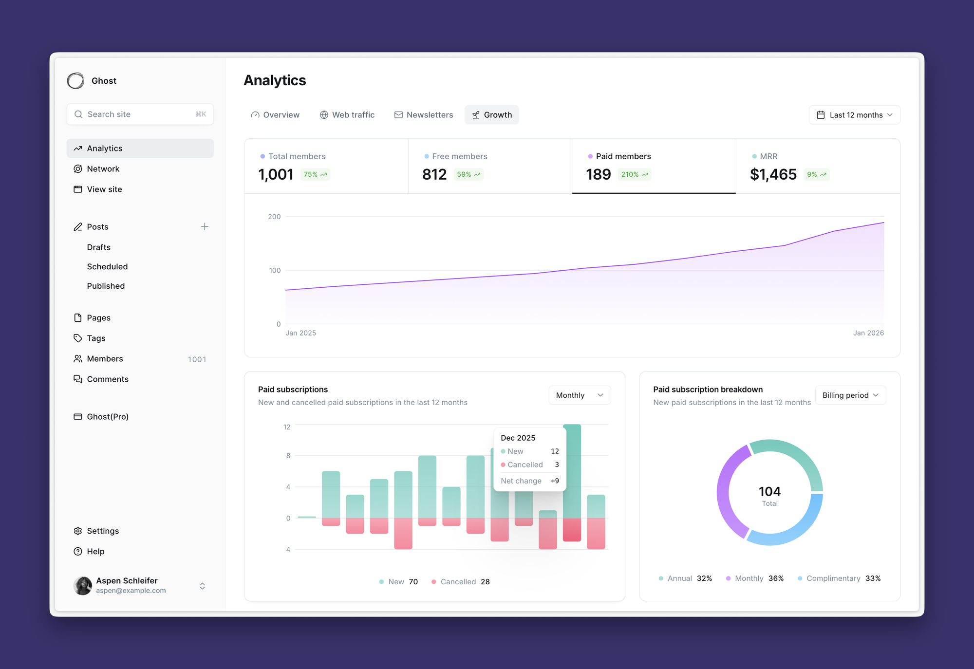 Understanding how your paid membership is growing — and where that growth is coming from — helps you see what's resonating with your audience. After launching native analytics in Ghost 6.0, publishers told us that some key paid membership insights were harder to spot than before.