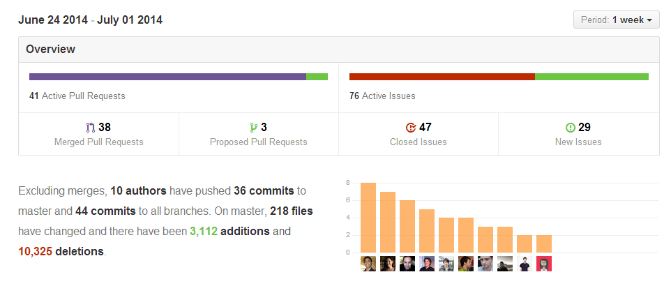 I thought I'd make these pulse screenshots a regular thing in the meeting write-ups. They're a great way to visualise and compare how active we've all been, and it gets the faces of our awesome contributors in the post. No so many different people this week, but we've closed the same number of issues. Awesome.