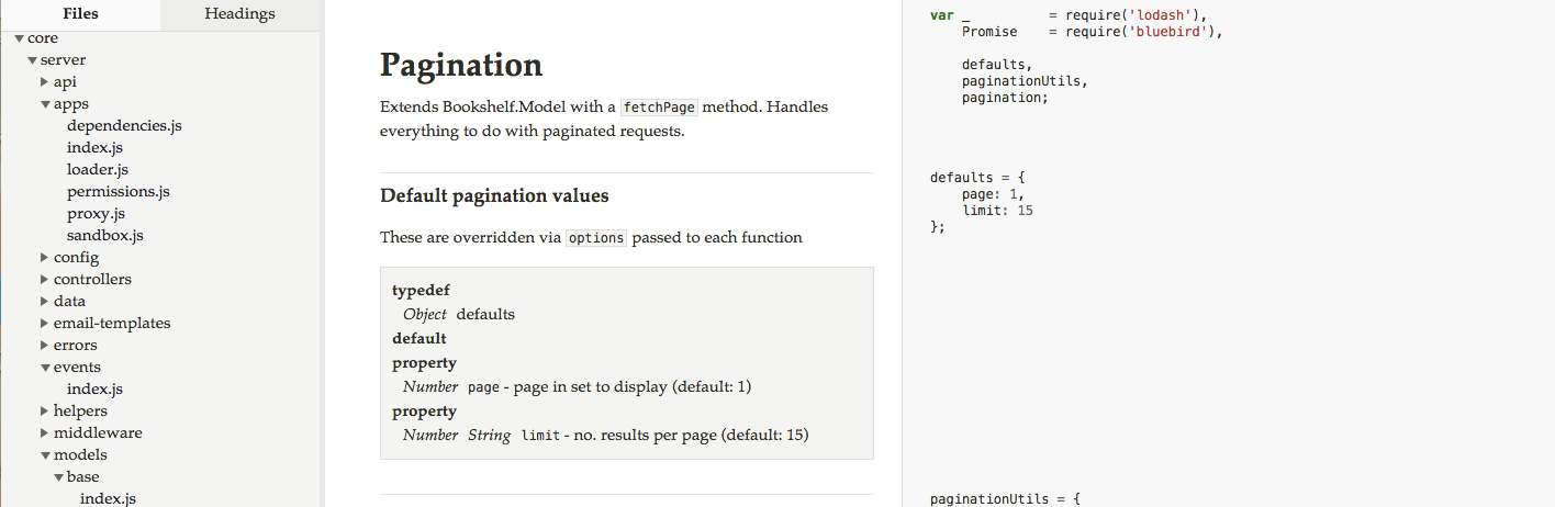 grunt docscan now be run to create documentation that looks like the picture below. The plan is to have these docs hosted oncode.ghost.organd update them with every release.