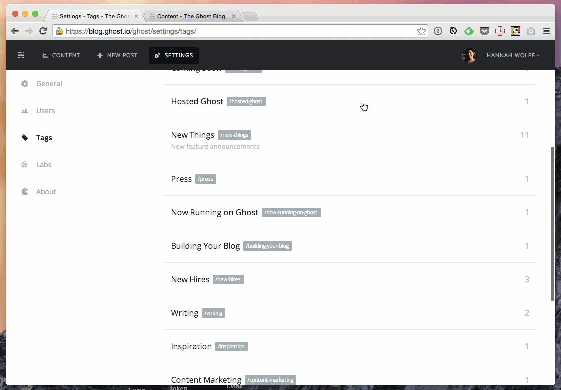 As of today, you can edit and delete your tags in Ghost - perfect for cleaning up those typos! Additionally you can personalise your tag archives by adding cover images and meta data to your tags.