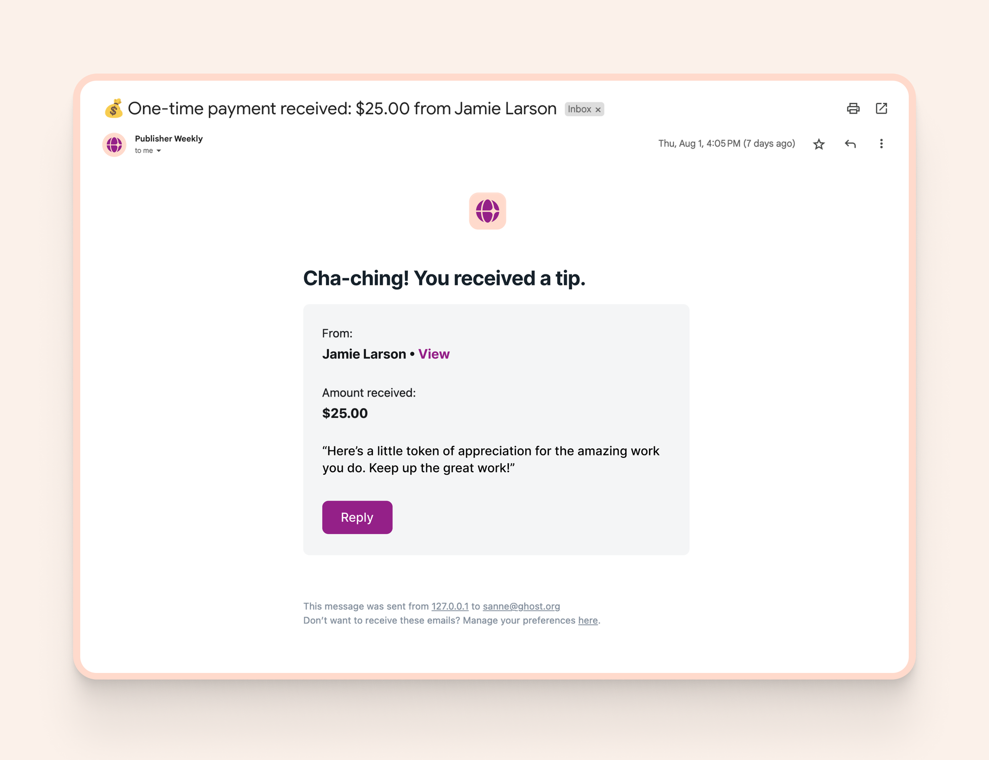 You’ll be able to set a suggested amount for people to tip, and use your payment link anywhere across your Ghost site; like in buttons, headers, email CTAs, or anywhere else that comes to mind.