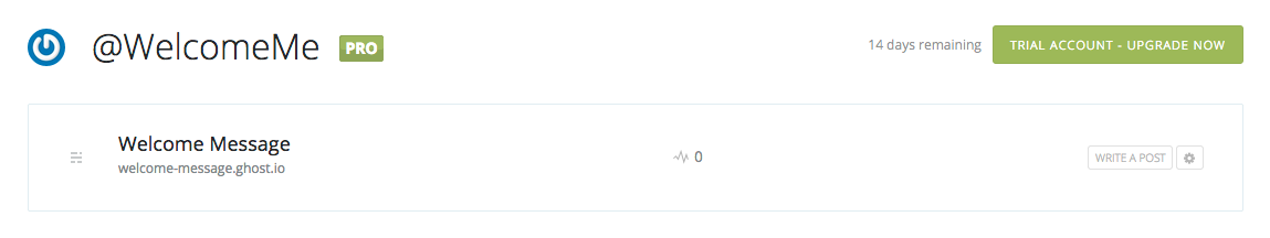 This was the old blog management screen on Ghost.org. Once you understand it, it makes sense: It’s a list of all your blogs, and this is the place where you can setup/shutdown and manage them. But when you’ve just started a new trial and all you see is one little list item… it’s not really clear what this is or what you’re supposed to do with it.