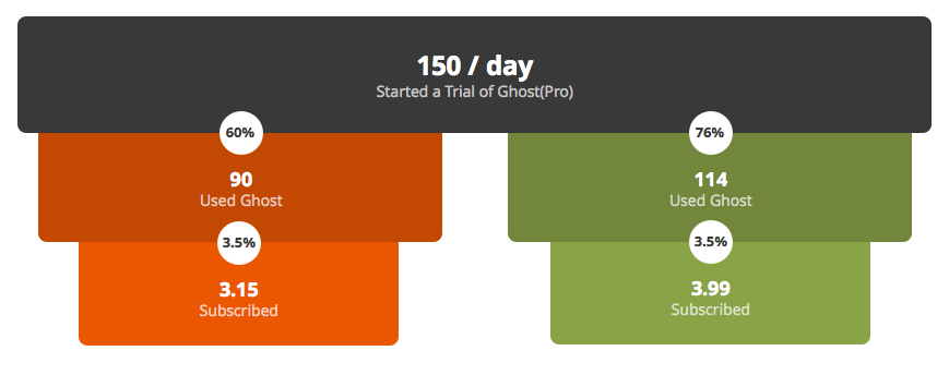 Today’s change isn’t nearly as dramatic - but it’s also not nearly as complex. While the last test took a good 40-50 hours of design, development and extensive testing. This time we spent 30 minutes on adding one <div> to one page, and it gave us 25% bump in how many people try Ghost every day.