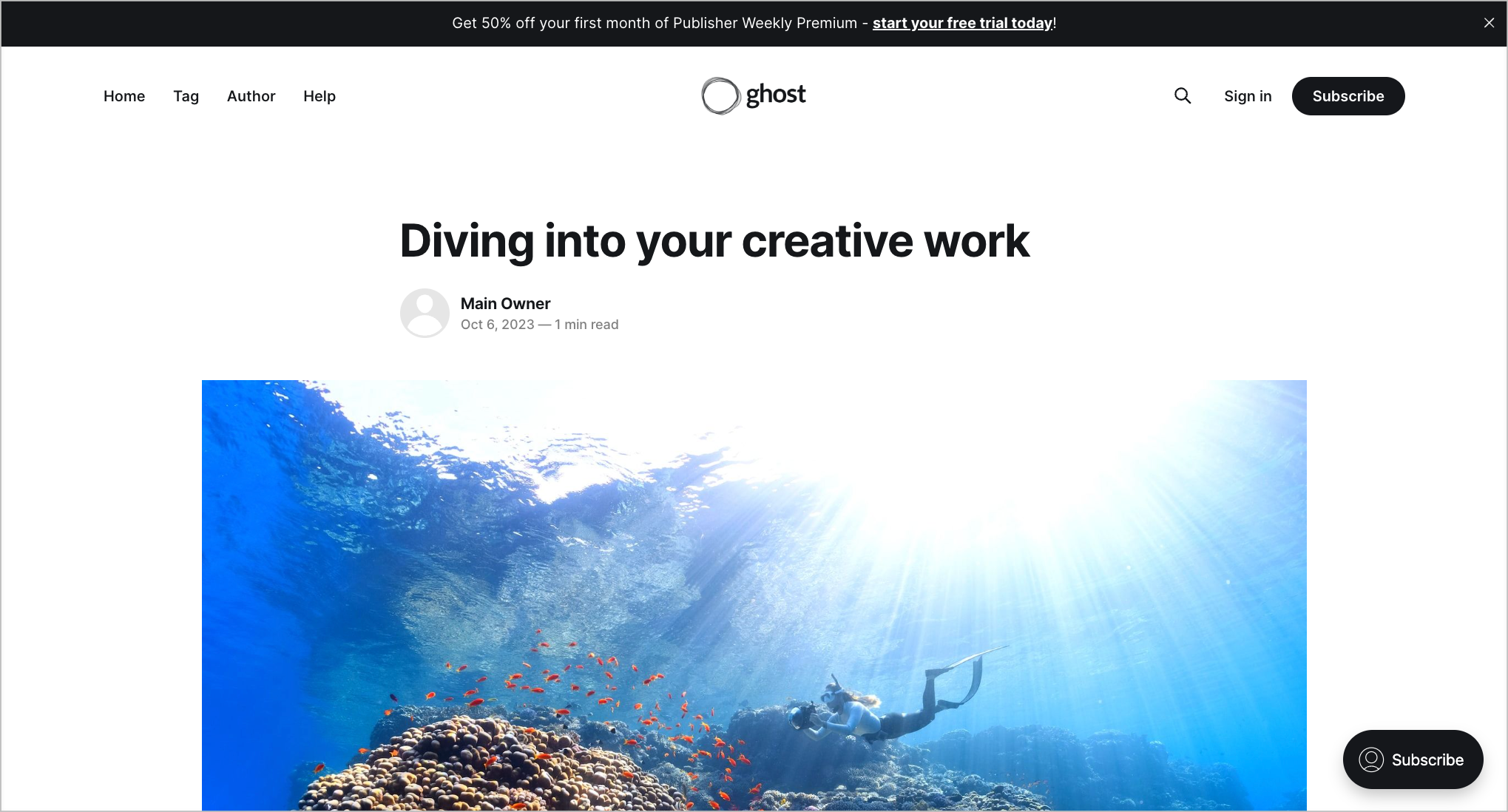 The announcement bar feature in Ghost allows you to add announcements at the top of your site, no matter which theme you are using. This means you can share stories, special offers, or breaking news with your visitors in a simple and effective way.