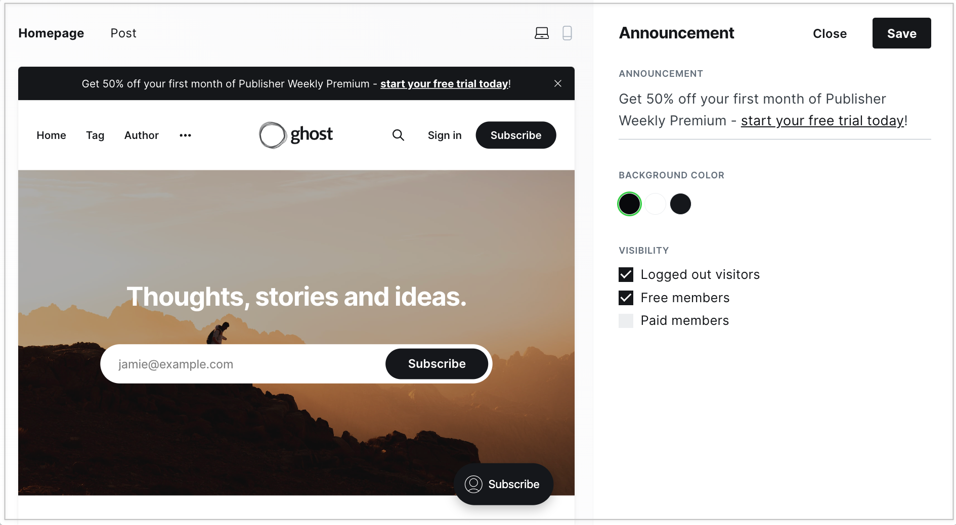 The visibility options allow you to show the announcement bar to logged out visitors, free members, and paid members — or a combination of the three. For example, this means you can share breaking news with every visitor of your site, share special offers with only new visitors and free members, or invite paid members to an exclusive community.