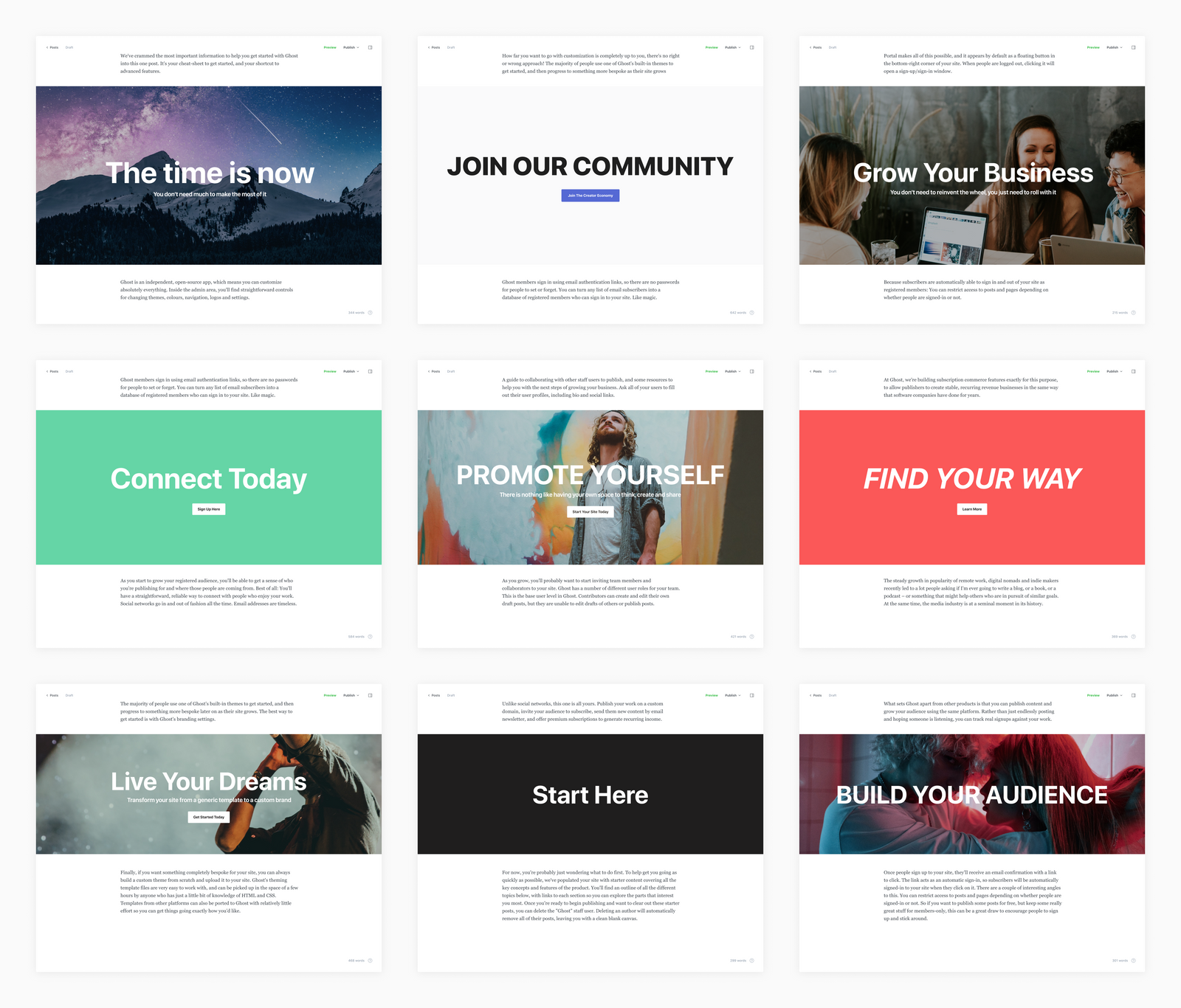 These cards can be used to attract membership on published posts, or custom landing pages, and include a variety of design options.