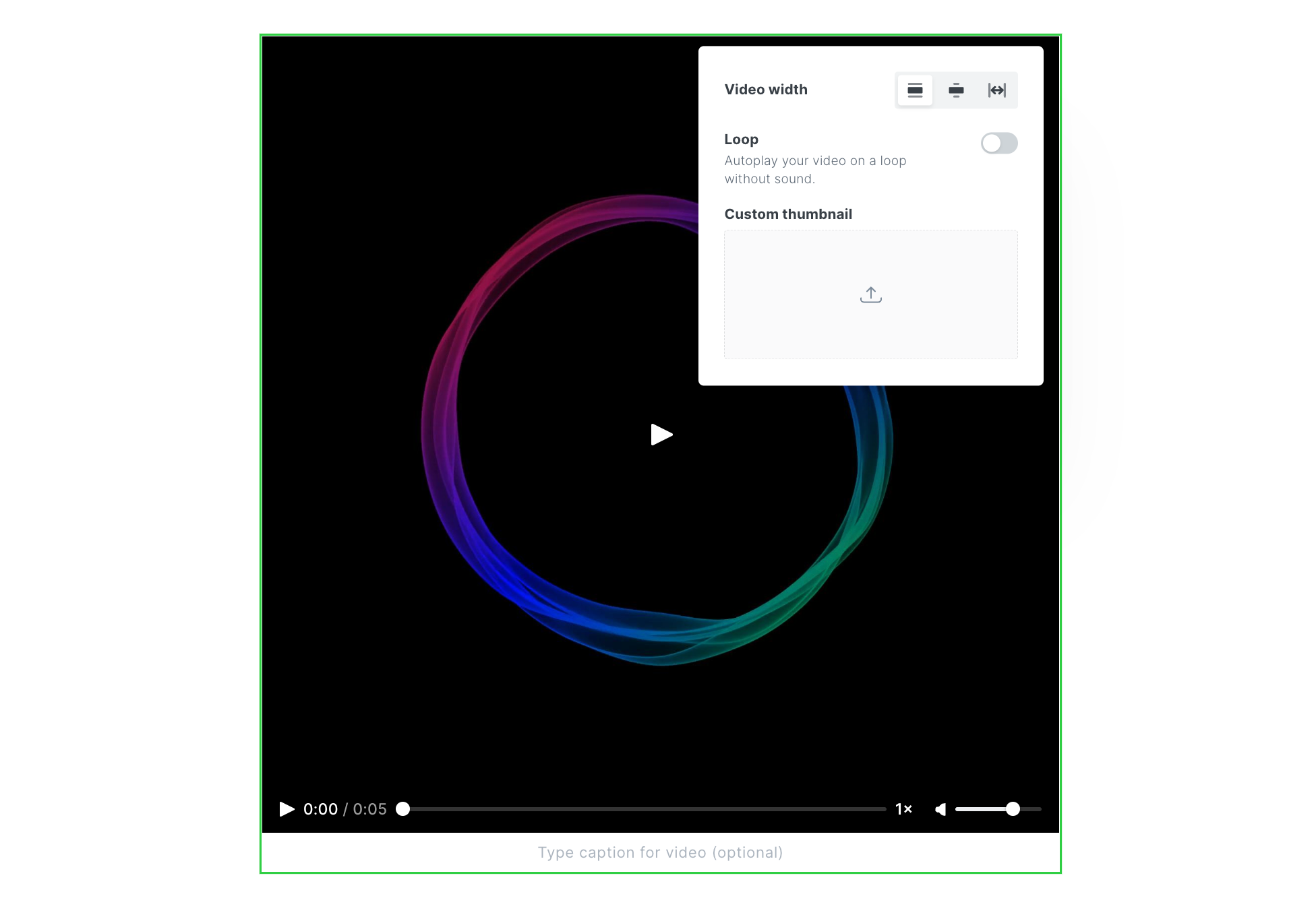 Once uploaded, your video is automatically rendered in a video player, and can be set to loop, have a custom thumbnail, and display in three widths.