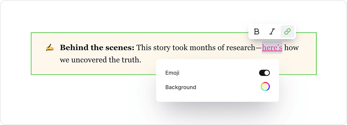 Callout cards allow you to add extra styling to important information on your posts and pages. Each callout card can include an emoji, text with styles and links, and a custom background color.
