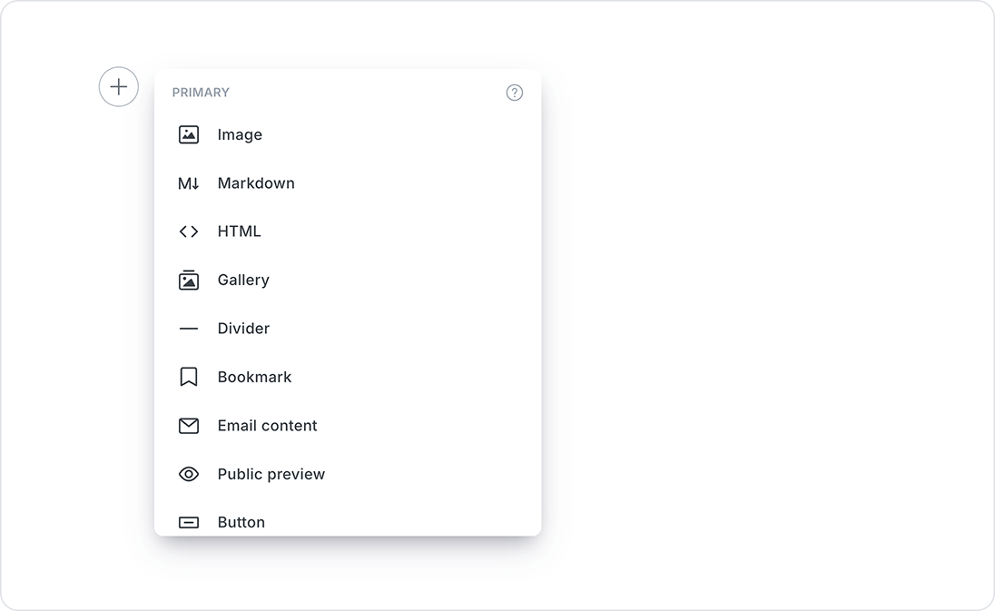 The Ghost editor includes rich media objects called Cards, which can be inserted into your content to add images, audio, video, data, and other interactive elements.