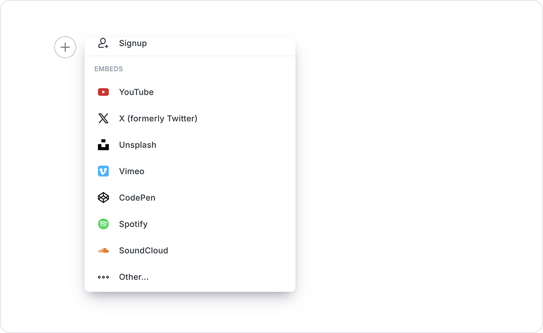 To add a Signup card within the editor, select the Signup card from the + card menu, or you can type / on a new line.