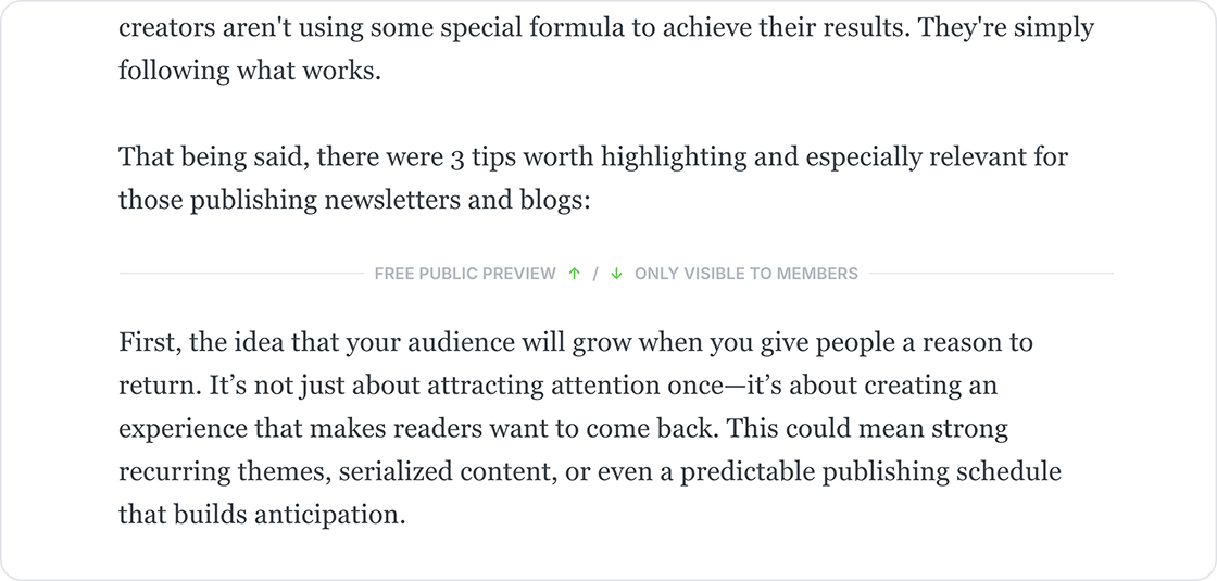 Public previews give you the flexibility to grow your paid audience, by giving general site visitors and free members a preview of paid-only content.