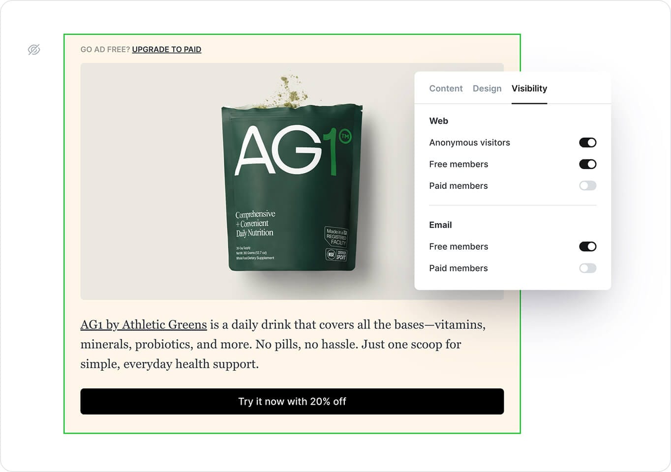 The Call to action card helps you promote a specific message to the right audience—whether that’s public visitors, free members, or paid members. You can choose to show it in your newsletter, on your website, or both.