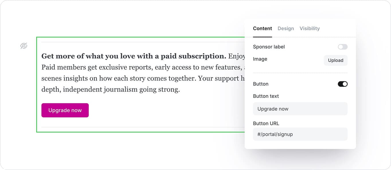 It’s a flexible way to highlight sponsored content, announce something important, or guide readers to take action. Add an image, an optional sponsor label, and a button that links anywhere—from your signup page to an external site. You can also customize the background color, button style, link color, and image layout to suit your content.