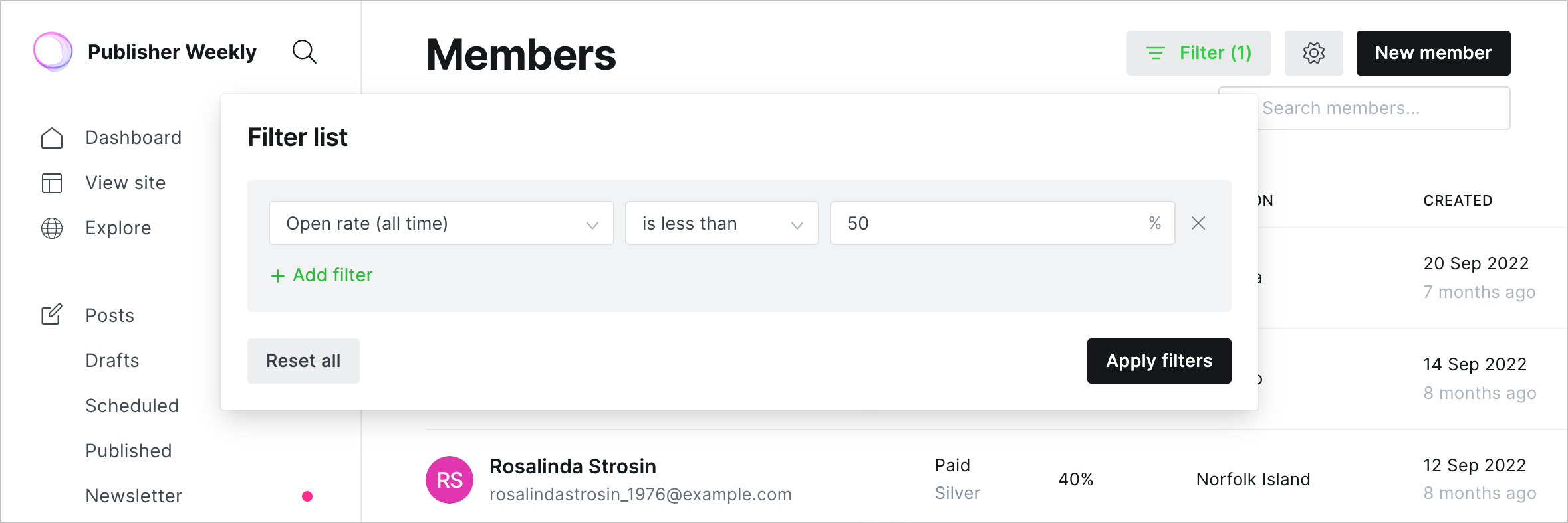 The members dashboard allows you to filter your member list and find out who the most and least active subscribers are using filtering, and also allows you to unsubscribe multiple members from email at once using bulk actions.