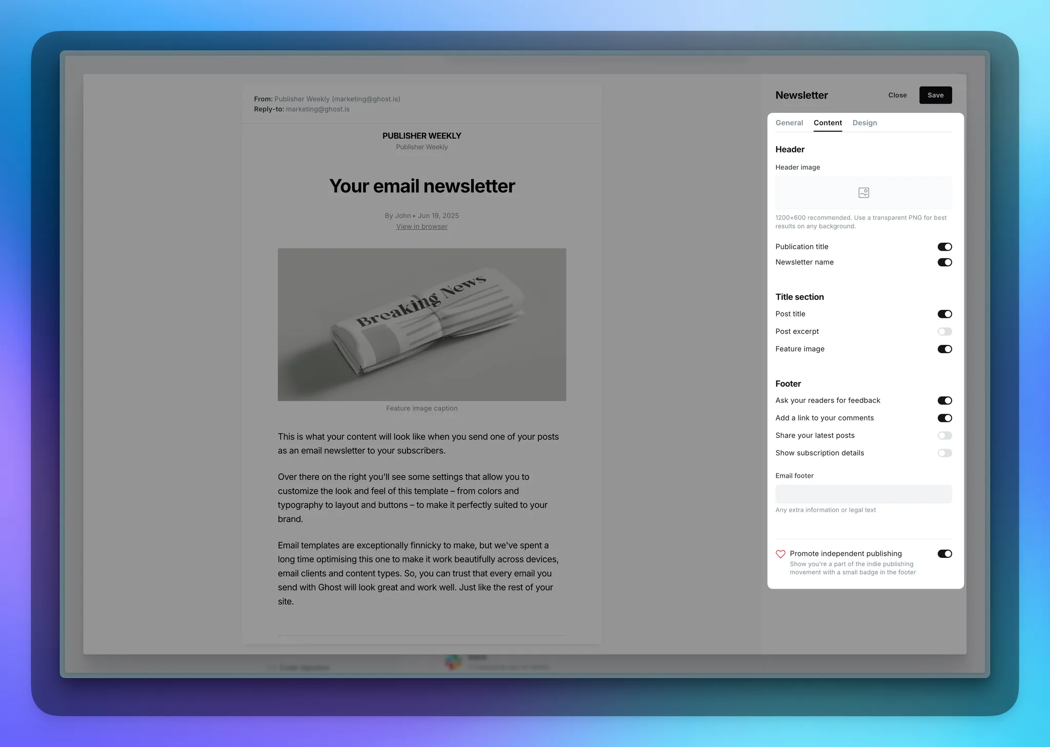 The "Published with Ghost" badge can be enabled or disabled from appearing at the bottom of each newsletter. It’s not required, but always appreciated! 🙏