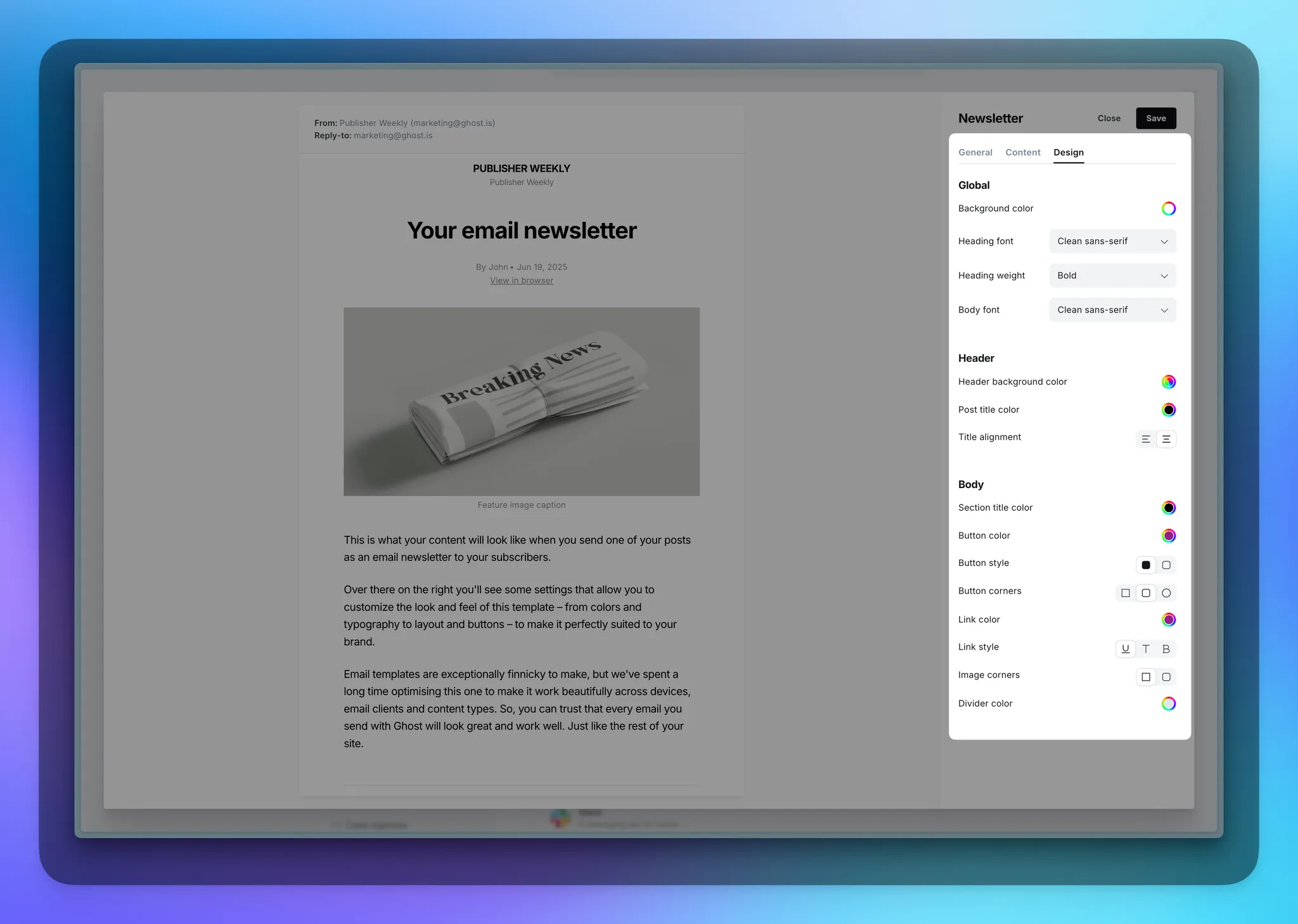 Your newsletter’s design settings let you create emails that look and feel uniquely yours — from colors and typography to buttons and borders — keeping your brand consistent across web and the inbox.