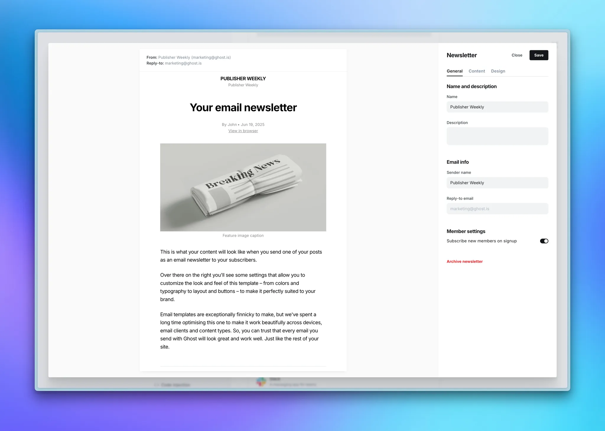 Email newsletters in Ghost come with a polished, customizable HTML template that works beautifully across all major email clients.