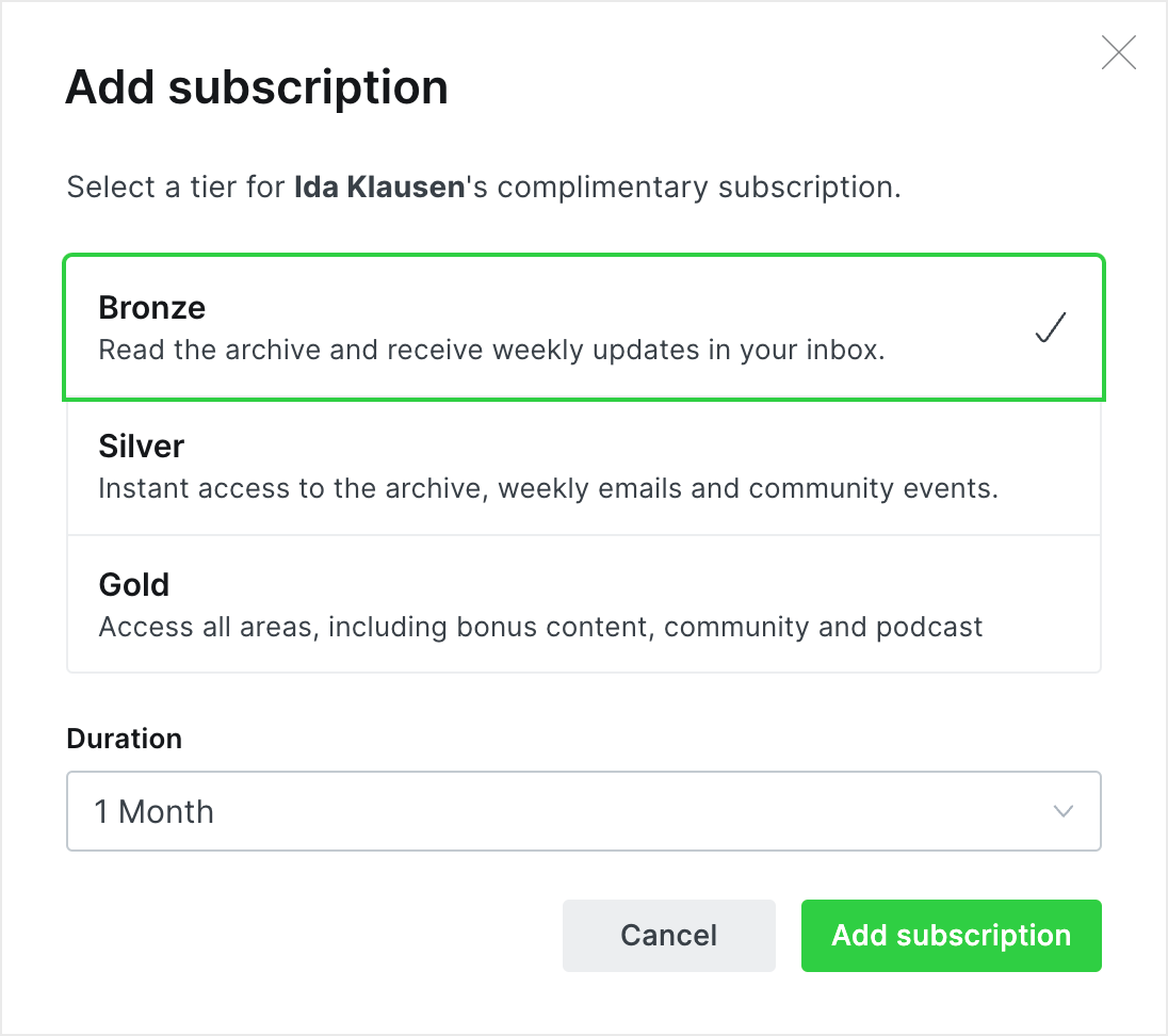 Complimentary plans can be configured for a custom time period of 1 week, 1 month, 6 months, 1 year or forever β granting paid access to members for the specified time.