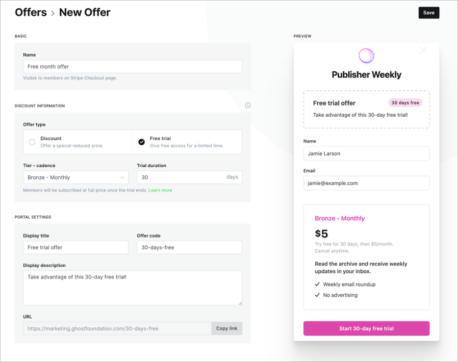 The offers feature in Ghost can also be used to create a free trial, which can be shared with a specific group of people via a custom offer link.