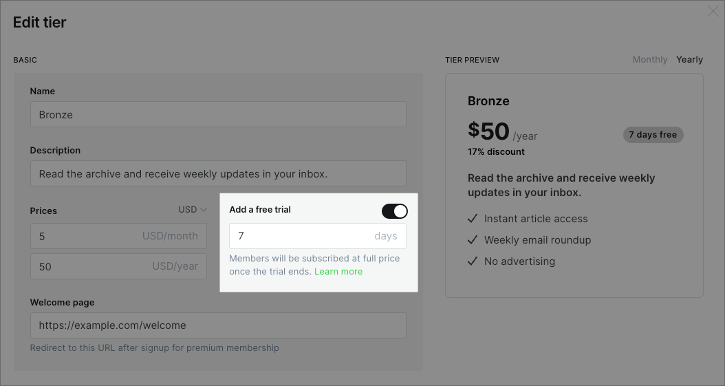 Offering free trials to your members is a great way to grow your paid audience. This gives them the chance to try out your premium content for free before committing to a subscription.