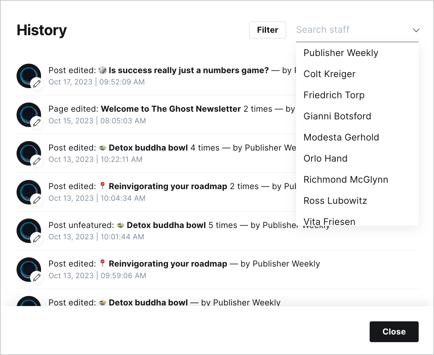 The history log allows you to view staff user events that take place on your site, so you can keep track of when changes are made to posts, pages, tags, integrations, tiers & offers, as well as settings and staff member profiles.