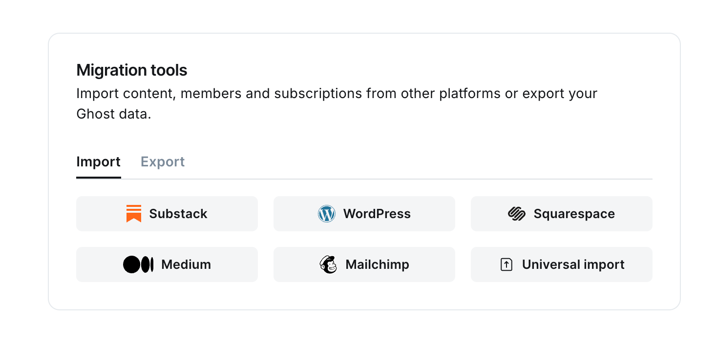 The Ghost importer allows you to import content and images directly to your new publication from Substack, Medium, MailChimp and other platforms.