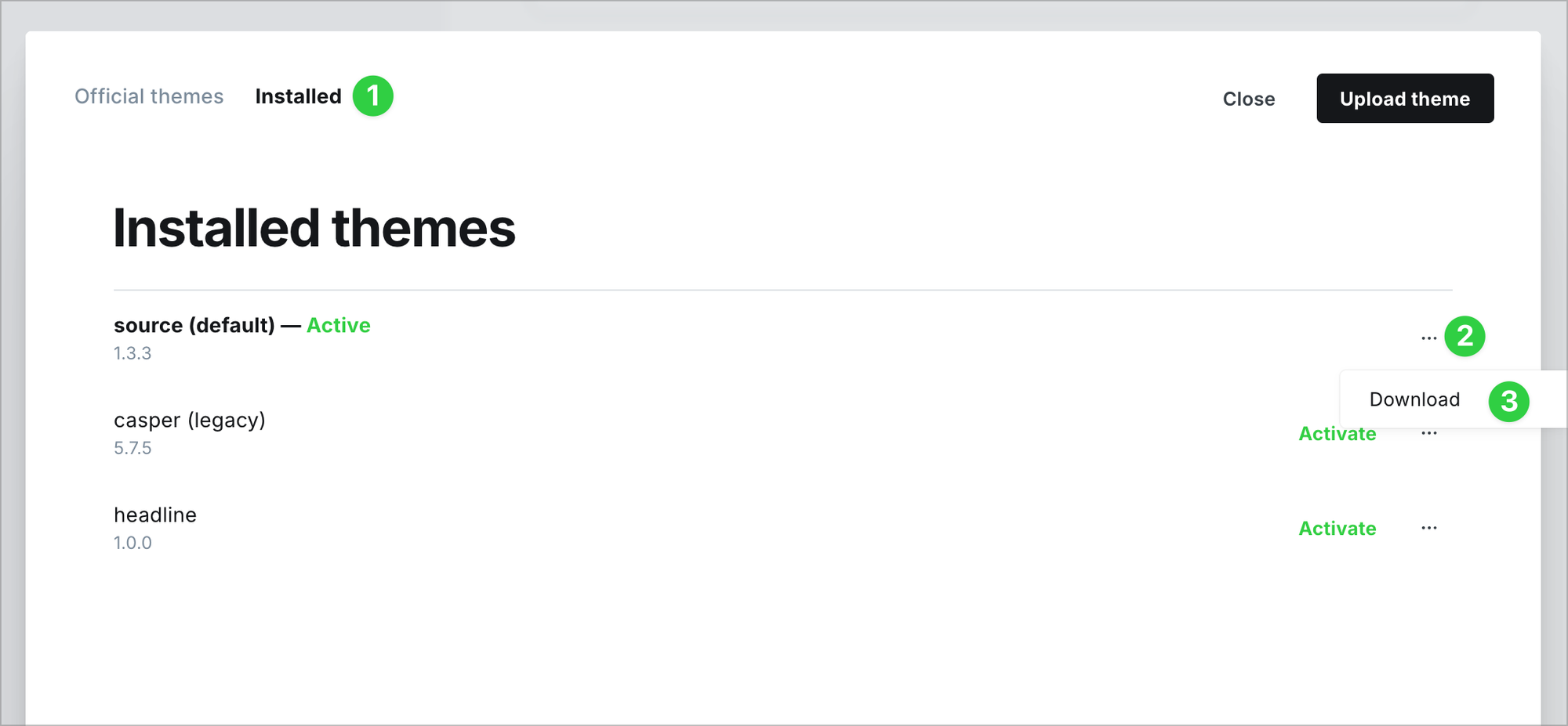 Select the Installed option to view your active theme and a list of your installed theme history. You can also download copies of your themes or switch your active theme to one that was previously installed.