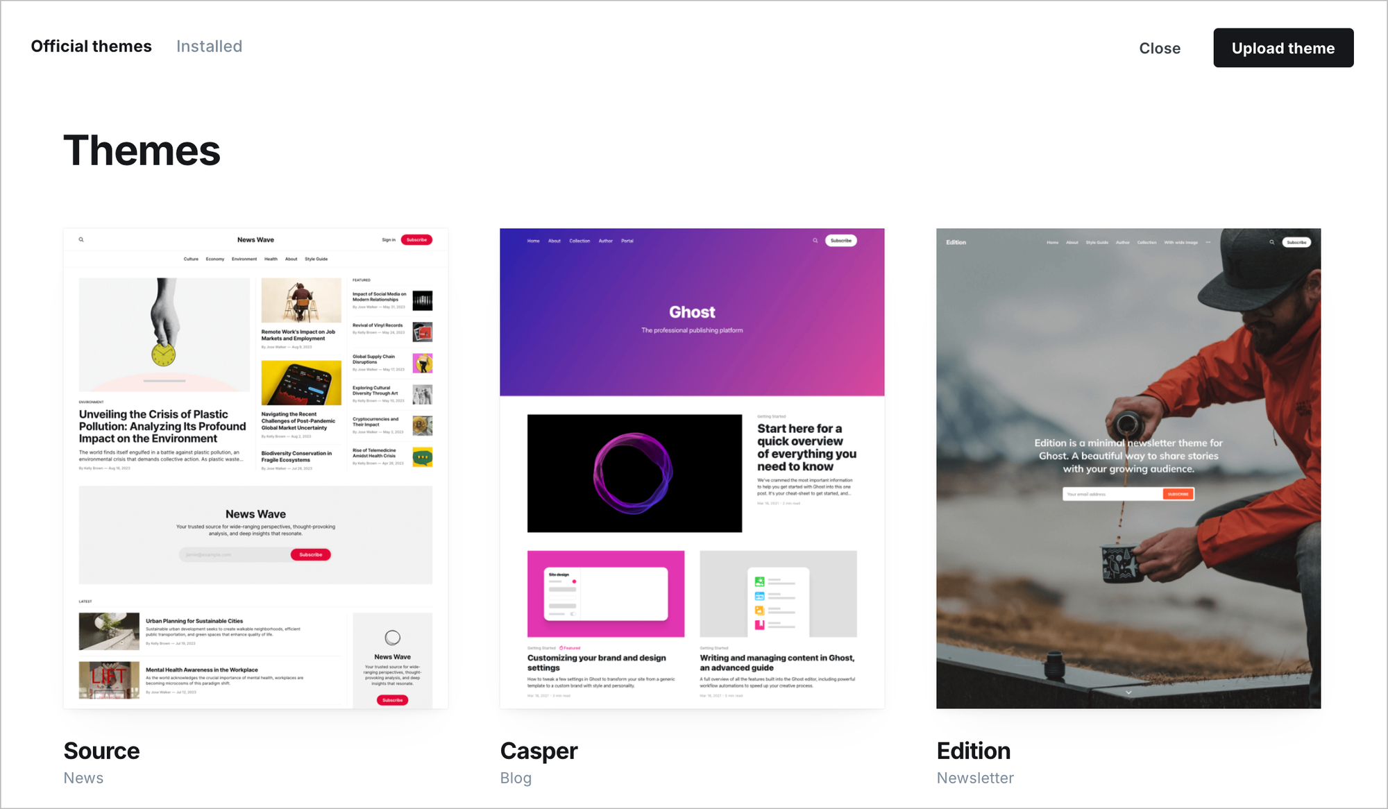 Keep in mind: Premium themes typically are more complex to use and work with compared to the free, official themes. However, you will also have access to customer support from the theme developer, who can help answer any questions you have about using their theme. All purchases of official themes happen outside of Ghost's Marketplace.