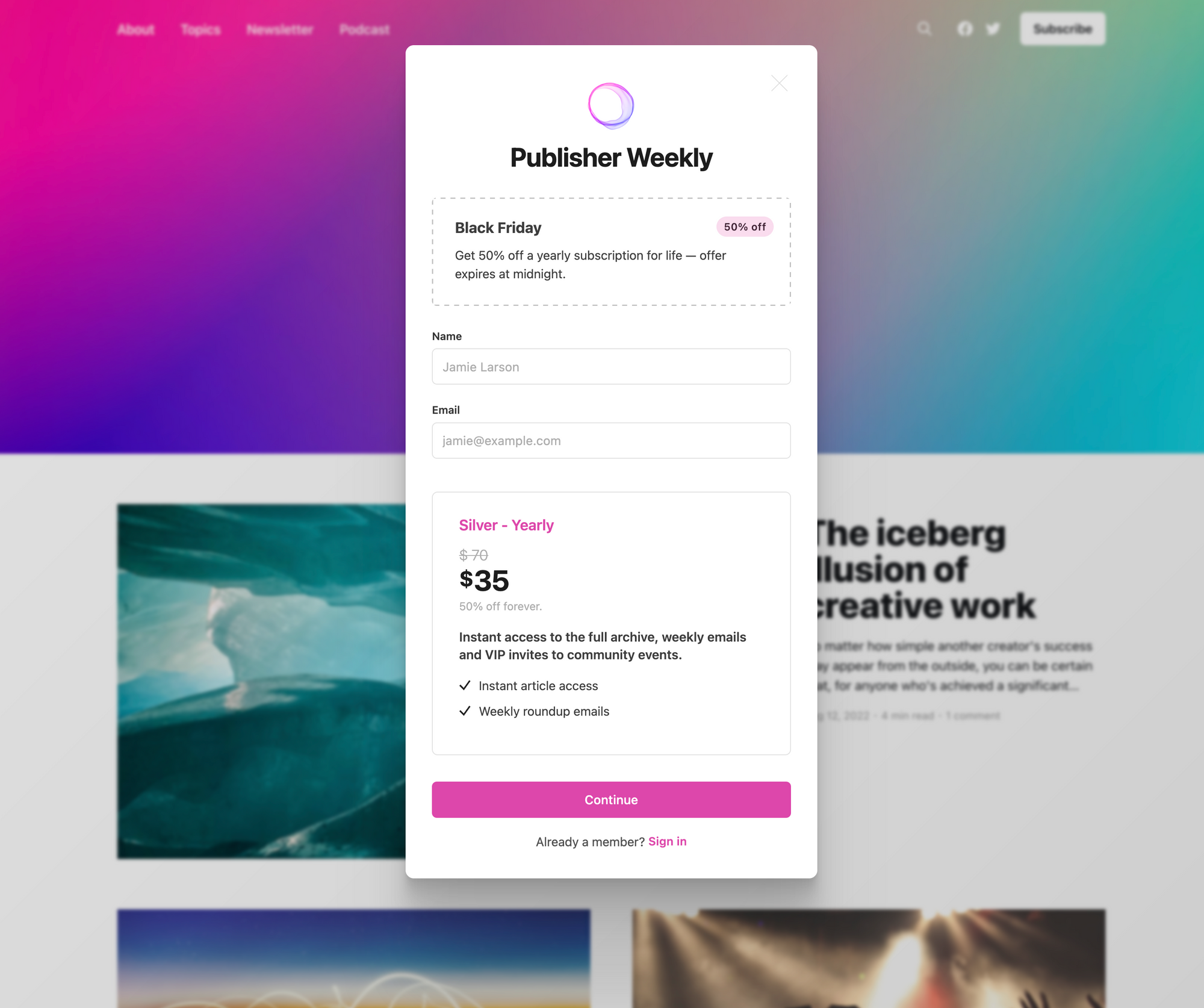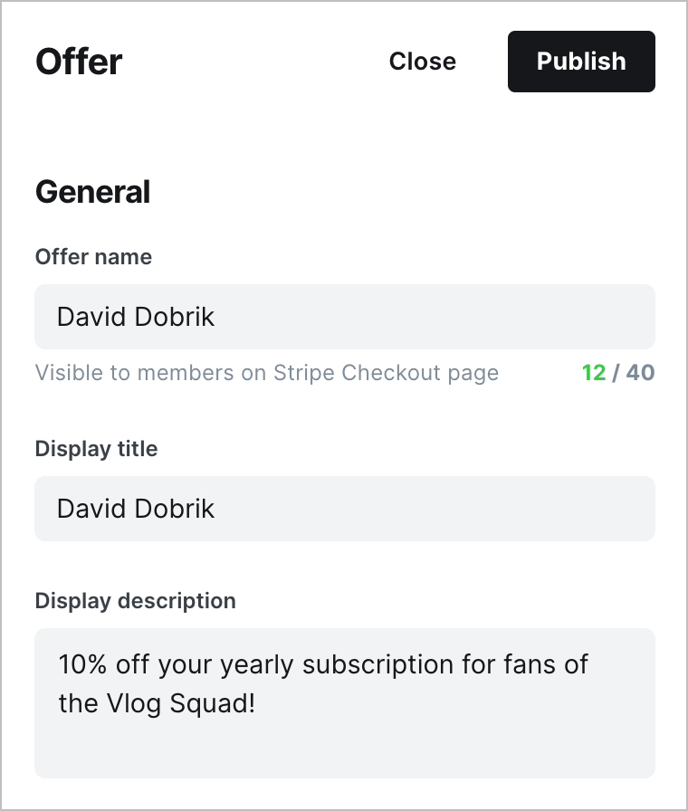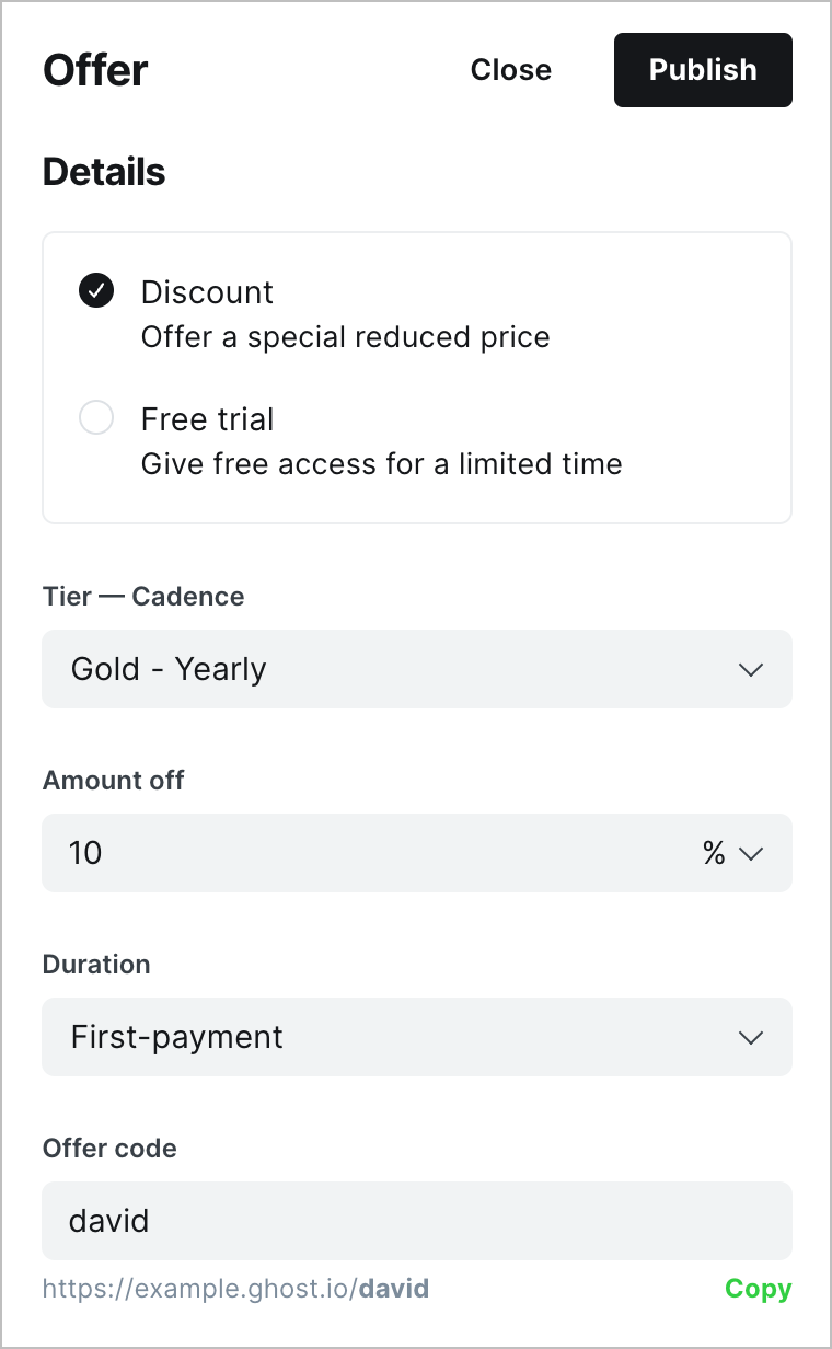 The offers system in Ghost allows you to convert more paid customers by offering shareable discounts to your audience, as well as offering free trials to your premium tiers.