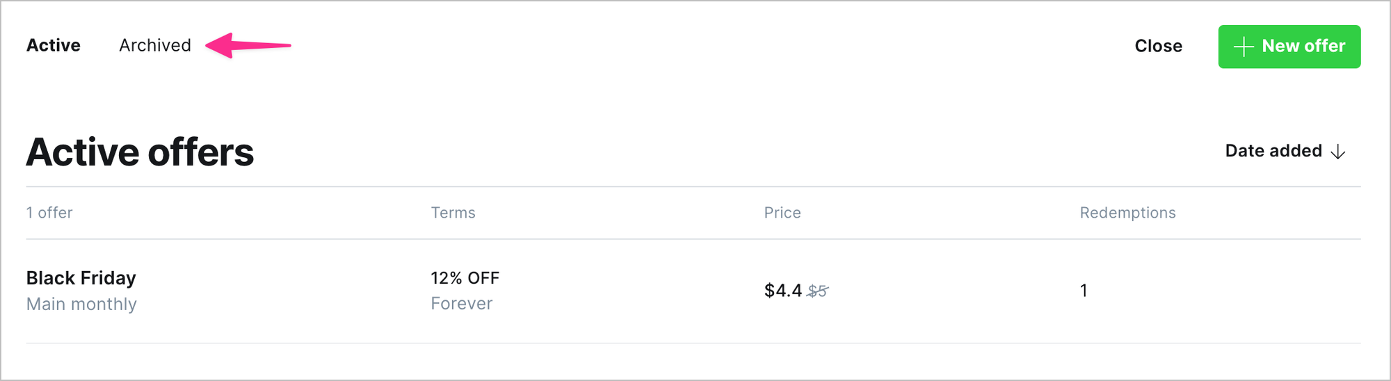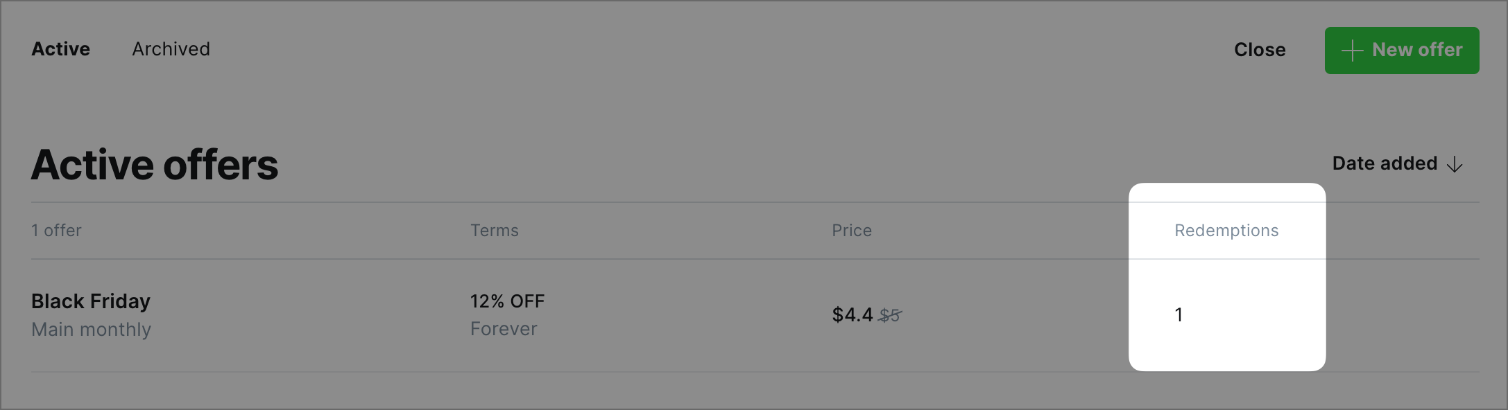Discount offers can be created for any tier, using a percentage or dollar discount amount. Discounts can be applied once, over multiple months, or forever. To configure a discount offer, go to Settings → Growth → Offers and click Manage offers. From the offers area, click + New offer.