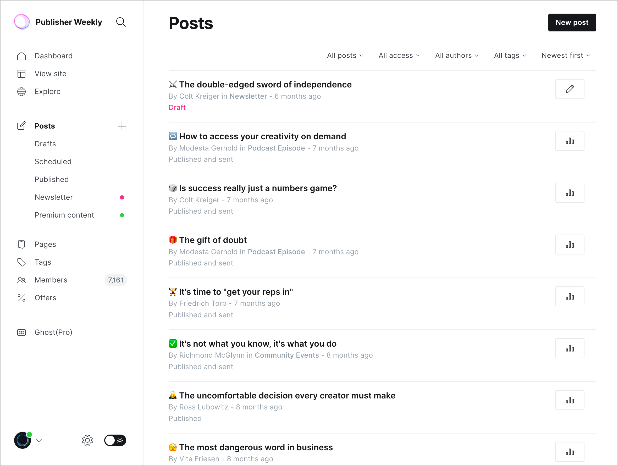 - Quickly filter all draft content, published content or featured posts
