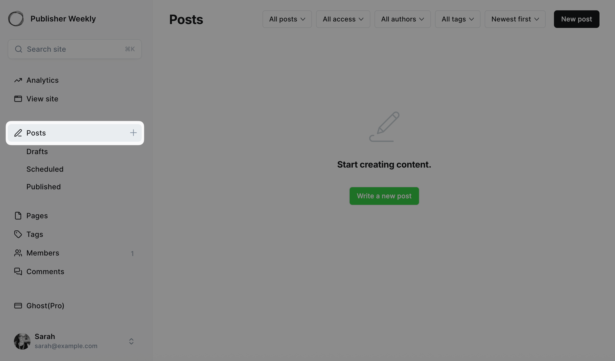 When posts are published on your site, they typically appear on your homepage, tag collection pages, author collection pages, and your site's RSS feeds. Posts appear in reverse chronological order by default, e.g. the newest post published on your site will always appear at the top of the homepage.
