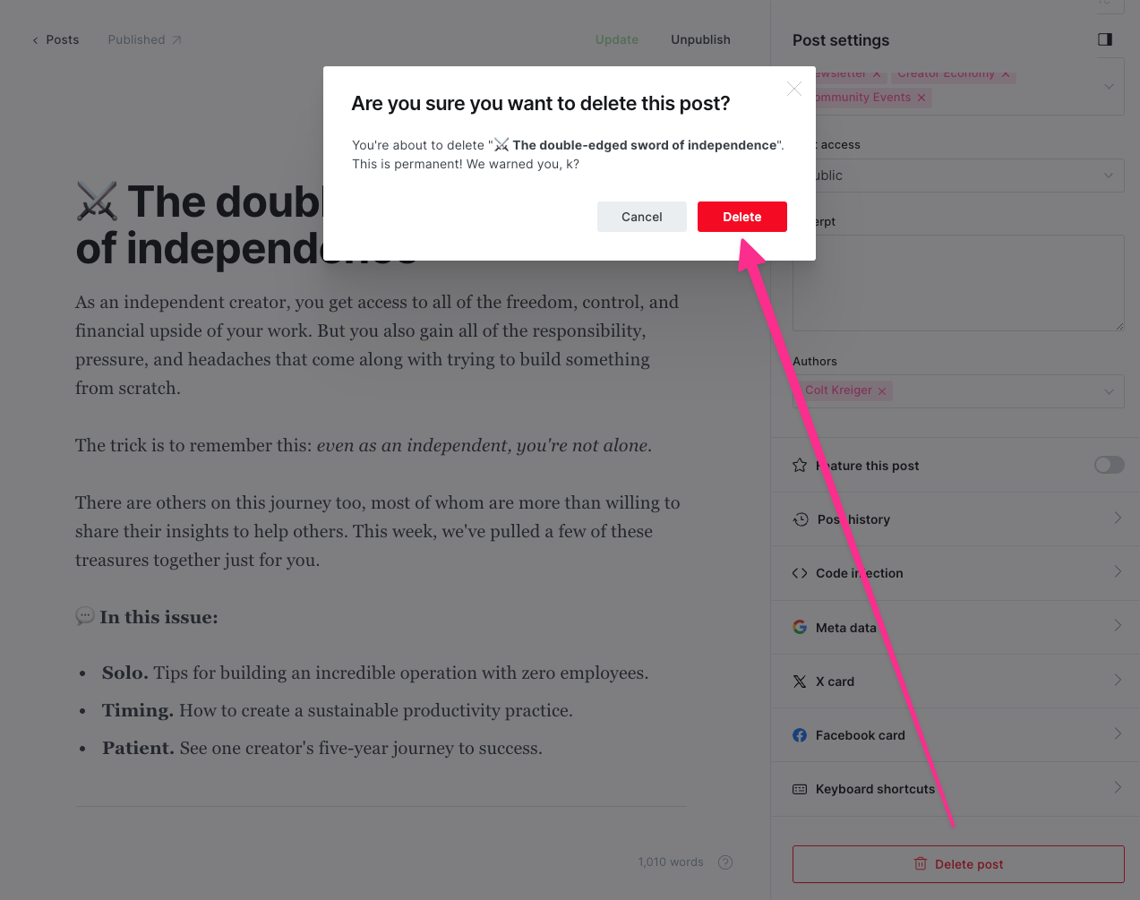Deleting posts is permanent, once deleted it cannot be recovered. Click the Delete post button at the bottom of the Post settings menu. A confirmation will open to make sure you want to complete this action.