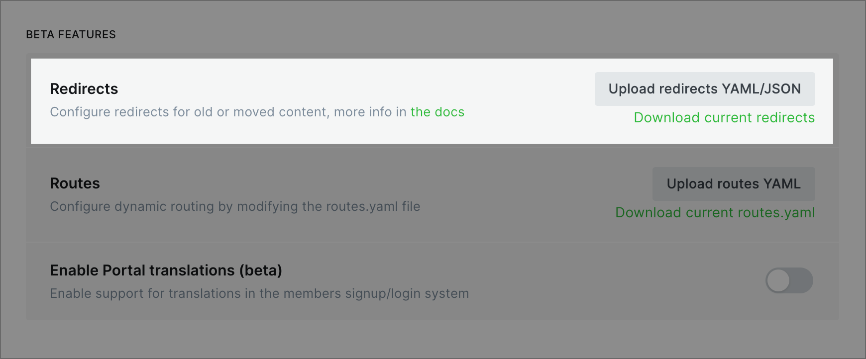 To implement redirects, go to the Settings → Advanced → Labs area of Ghost Admin. Open the Labs area using the Open/Close toggle, and select the Beta features tab.