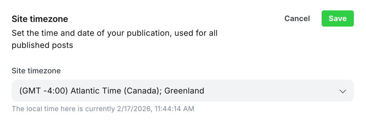 You can set the timezone of your publication from the Settings → General → Timezone area. When a custom timezone is set, this will be used for scheduling and publishing posts.