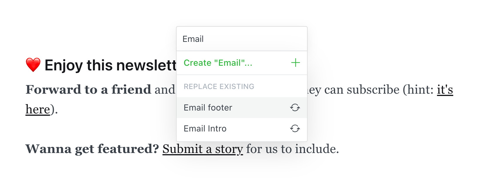 To insert a snippet into a new post, use the dynamic card menu to select your snippet or type /{snippet title} onto a new line of the editor.