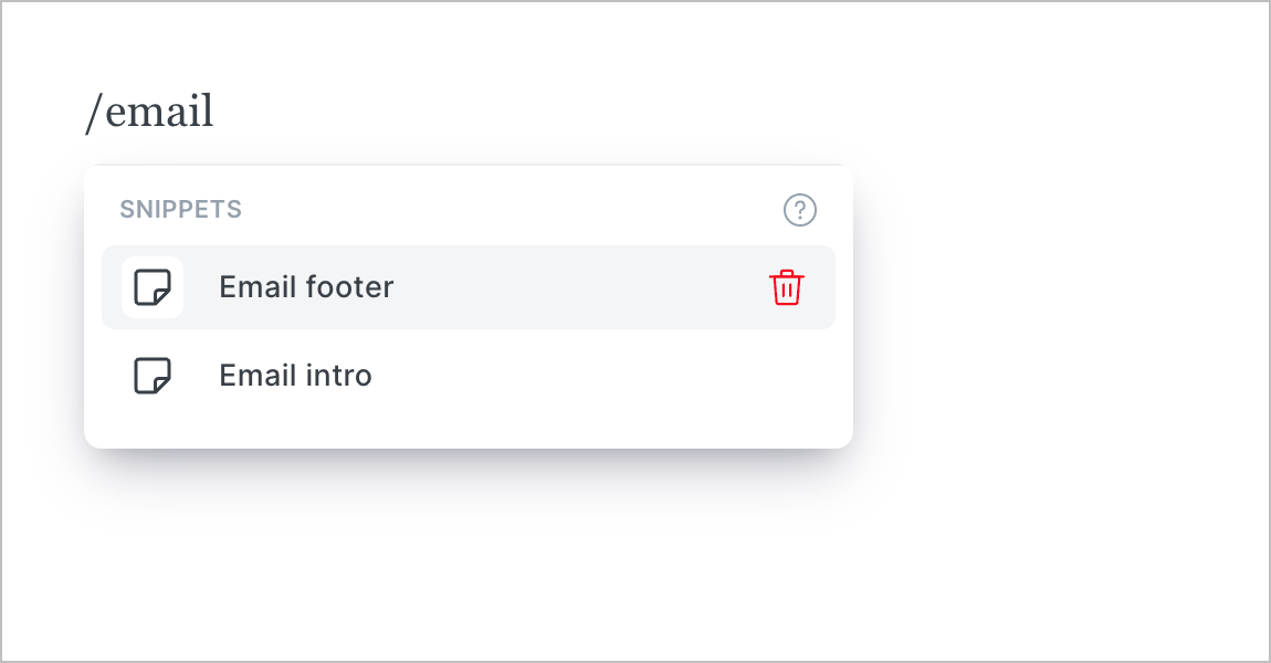 To delete a snippet, you can use the dynamic card menu to view your snippet list, or type /{snippet title}, then hover over the snippet you want to delete with your cursor, and click on the trash can icon.