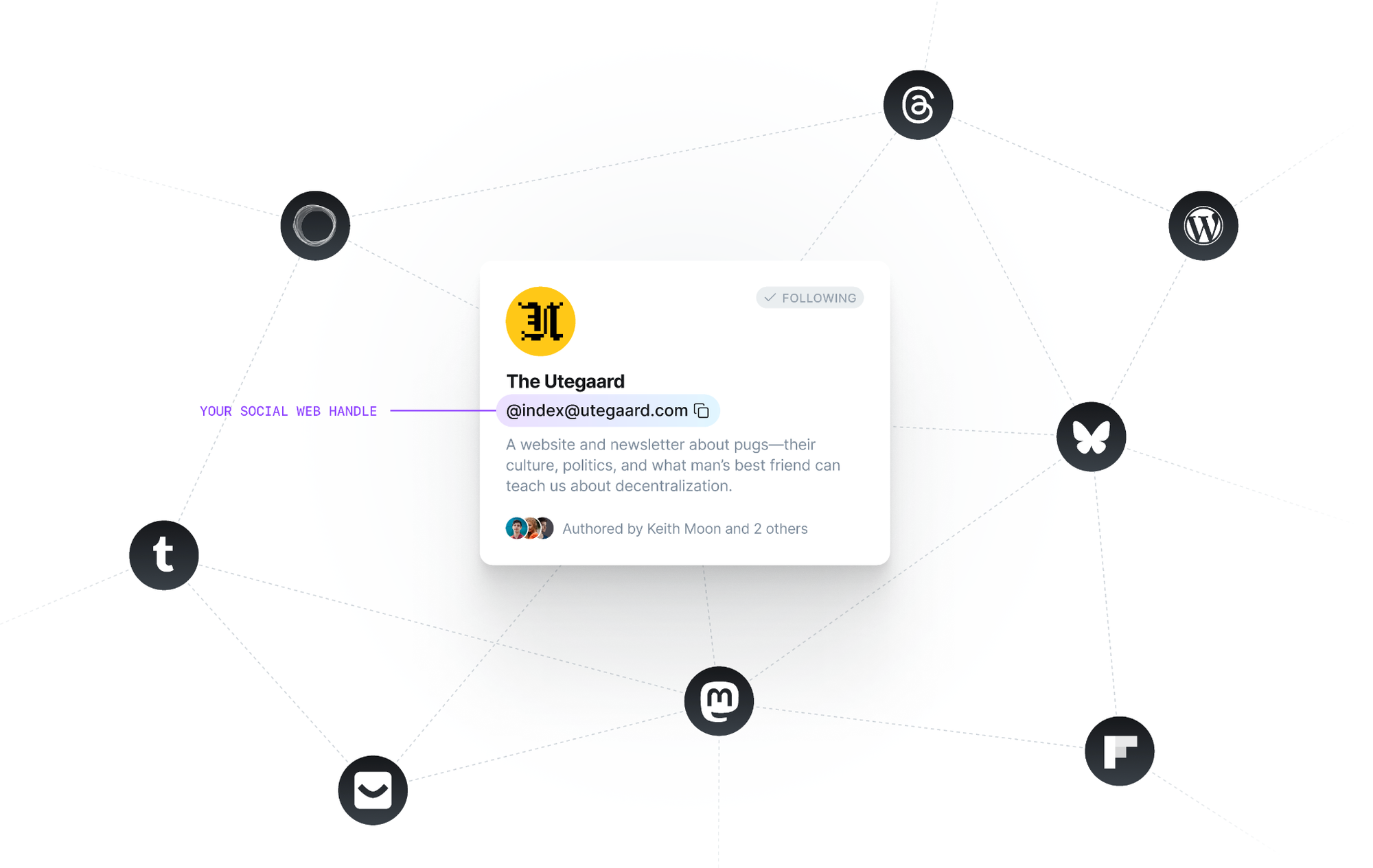 The social web is different. For a start, it’s open and decentralized which means no one company controls it. Instead, you're able to build a social connection to your fans and peers across platforms — directly from inside Ghost. Your audience is no longer limited only to people who use the same platform as you.