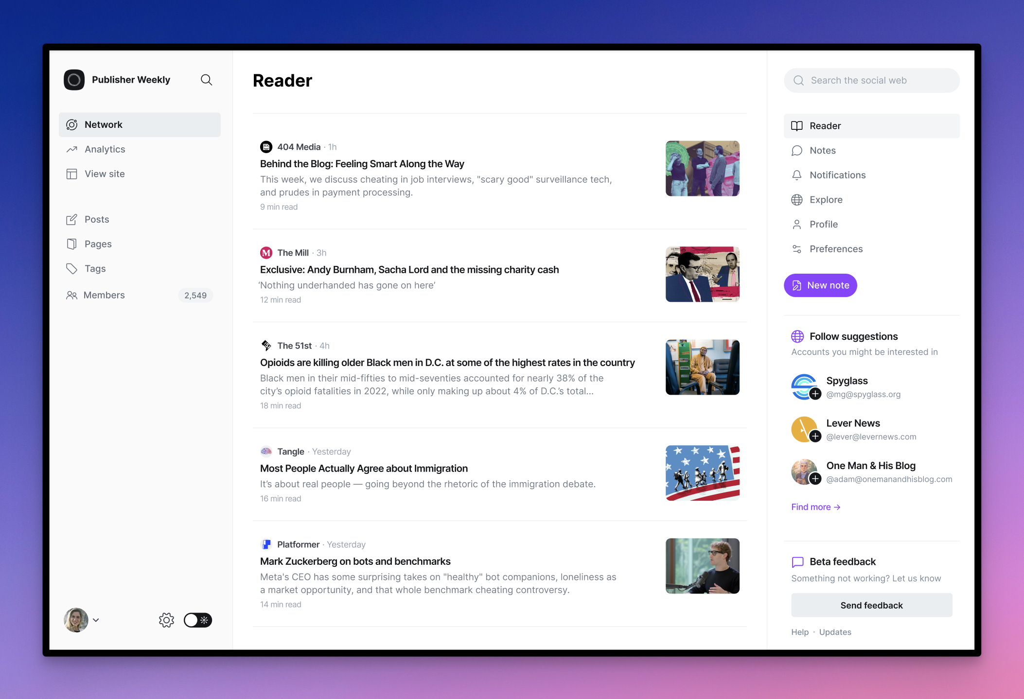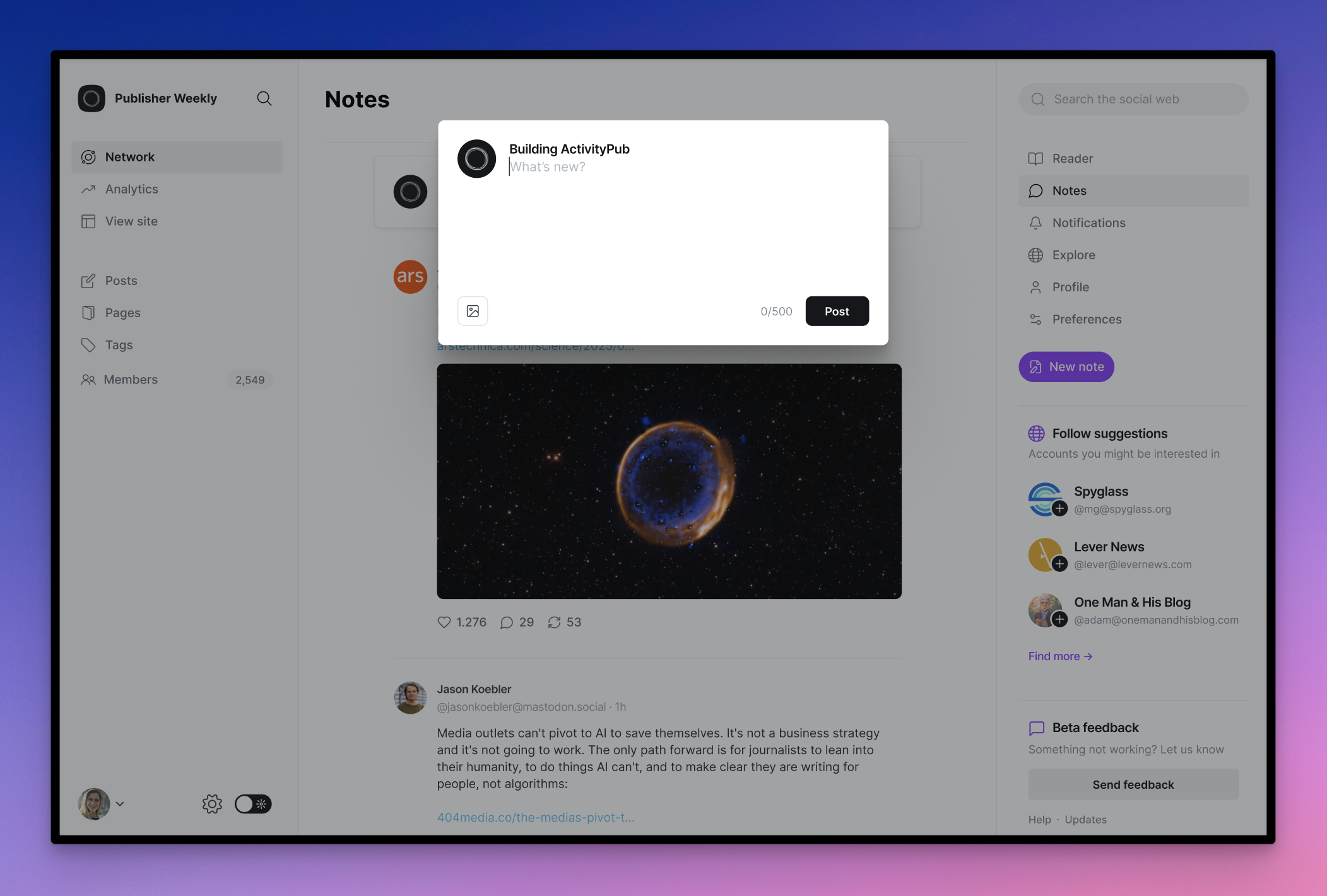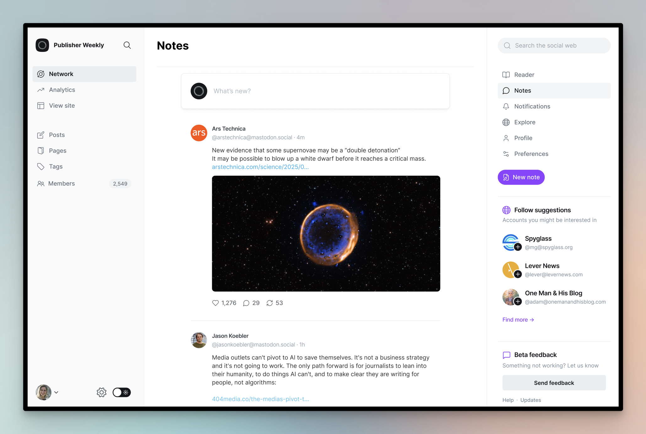Ghost now has a social web reader built directly into admin, where you can receive and read posts from people you follow. Content is split into two areas: The Reader shows long-form content and articles, and Notes is where you'll find short-form content and everything else.