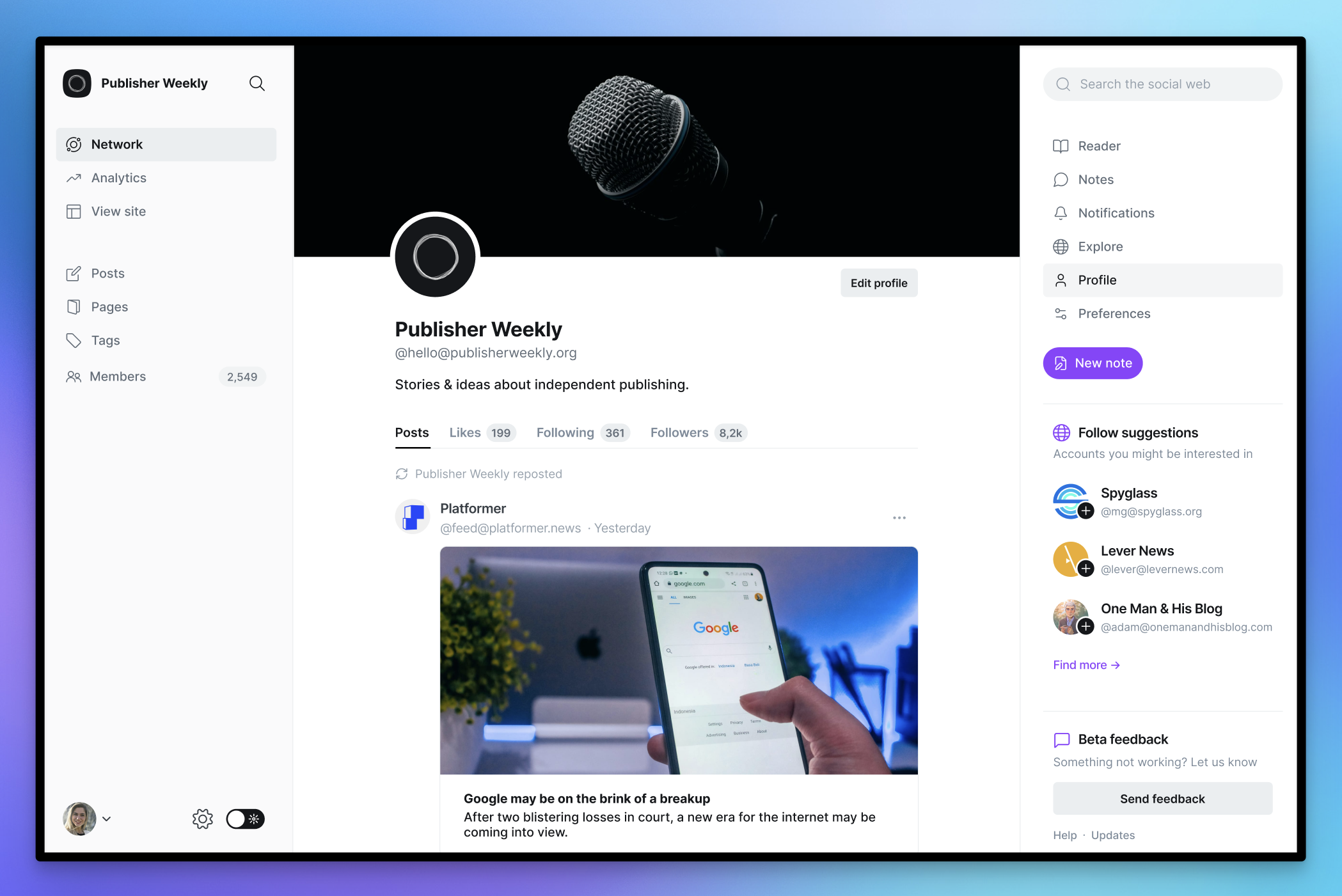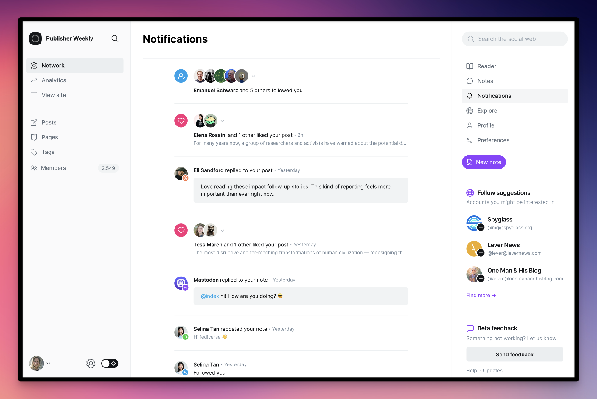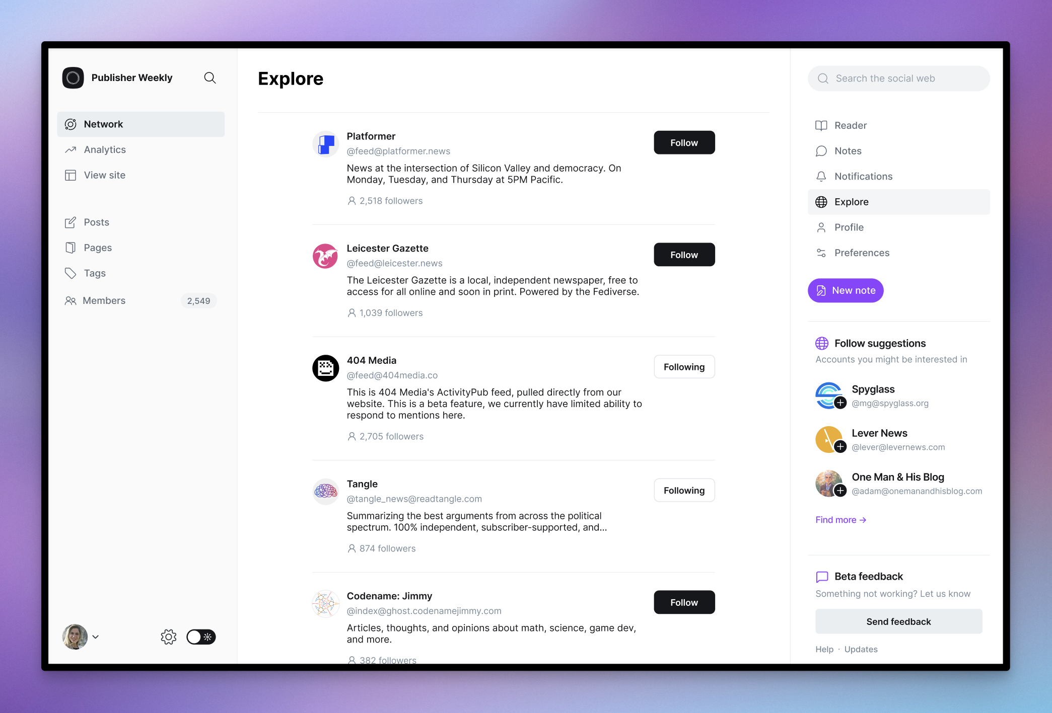 Ghost now has a social web reader built directly into admin, where you can receive and read posts from people you follow. Content is split into two areas: The Reader shows long-form content and articles, and Notes is where you'll find short-form content and everything else.