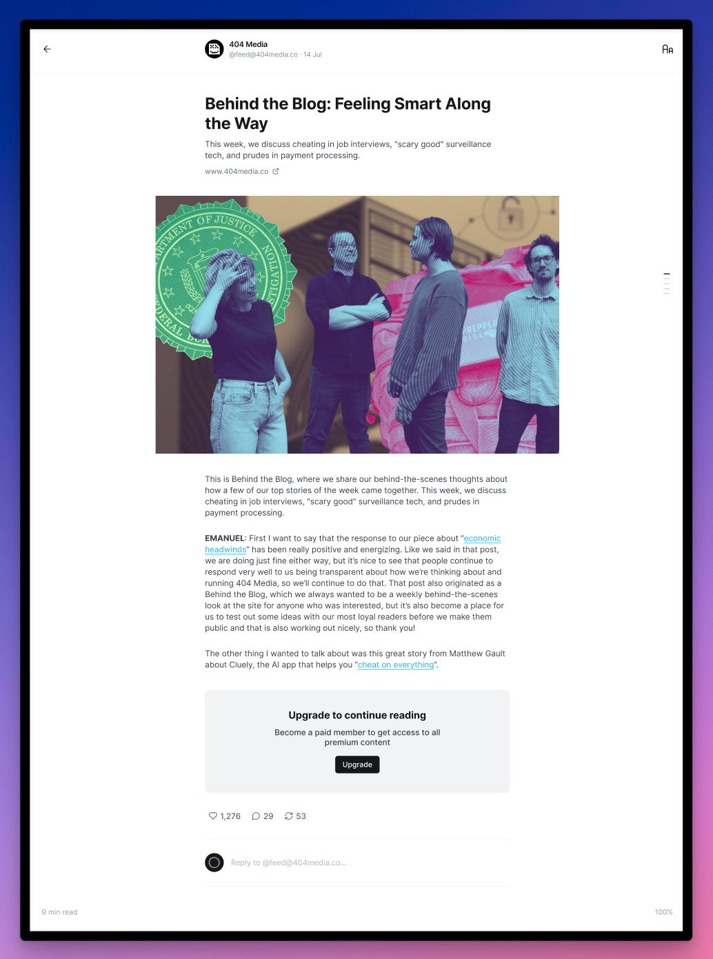 Clicking on a post will open an inline reader view, right inside Ghost, and when you get to the end you'll be able to like, repost or reply.