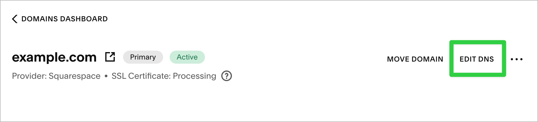 Once logged in click Domains, and select the domain you’d like to configure with your Ghost(Pro) site, then click Edit DNS from the domain dashboard to access your DNS records for the domain.